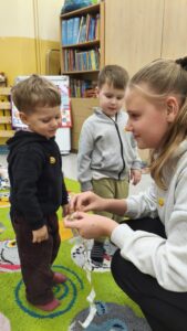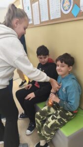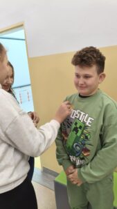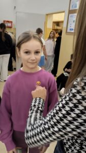 Przedstawiciele Samorządu Uczniowskiego z uśmiechem przyklejali uczniom i nauczycielom wesołe buźki, życzyli miłego dnia, obdarowywali serdecznymi pozdrowieniami oraz zachęcali do dzielenia się uprzejmością z innymi. Ich energia, zaangażowanie i otwartość sprawiły, że atmosfera w szkole stała się szczególnie radosna i pełna wzajemnej życzliwości. Tego dnia nie zapomniano również o najmłodszych. Uczniowie klas I–III oraz dzieci z młodszych oddziałów otrzymali kolorowanki przygotowane specjalnie z okazji Dnia Życzliwości i Pozdrowień. Dzięki nim nawet najmłodsi mogli włączyć się w świętowanie, rozwijając swoją kreatywność i jednocześnie ucząc się, jak ważne są drobne gesty dobroci wobec innych.