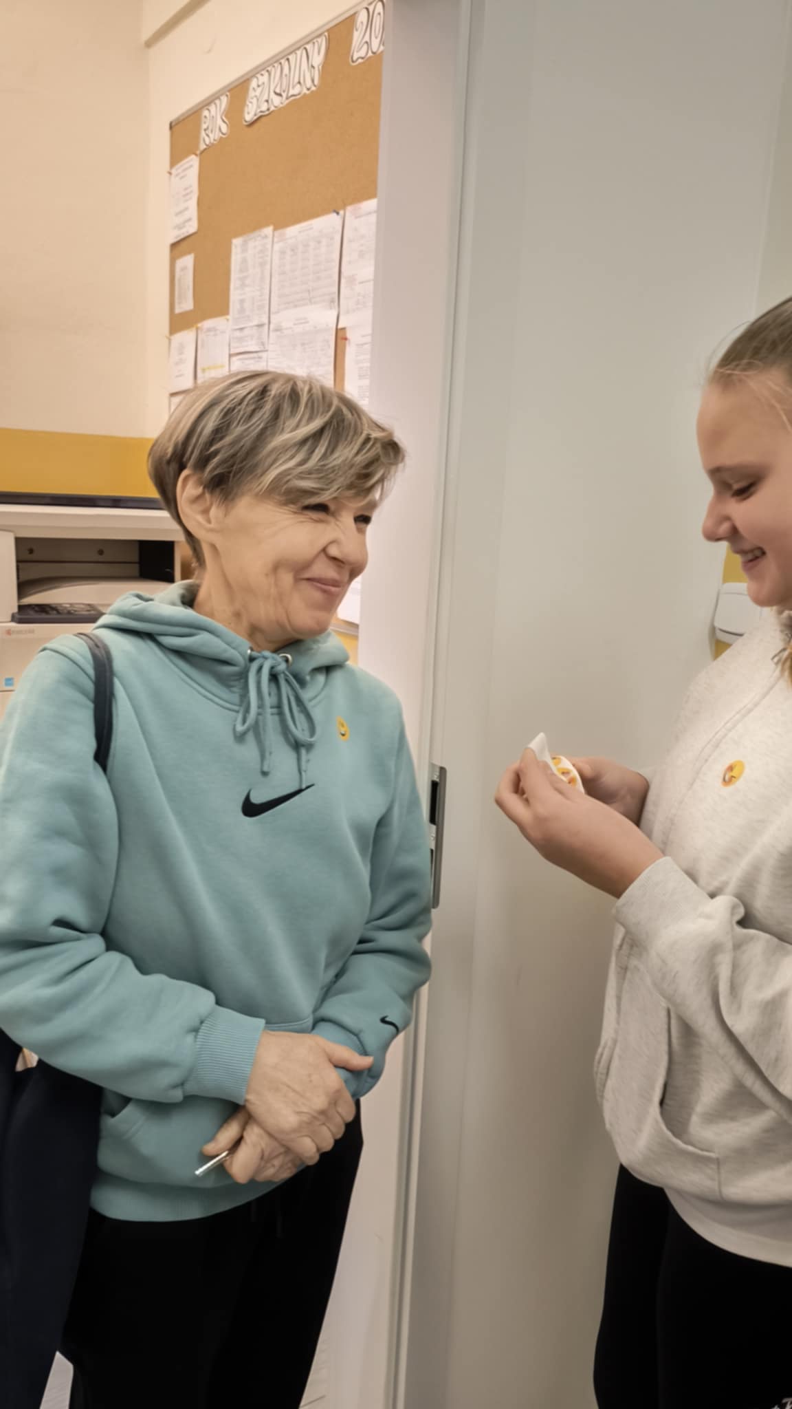 Przedstawiciele Samorządu Uczniowskiego z uśmiechem przyklejali uczniom i nauczycielom wesołe buźki, życzyli miłego dnia, obdarowywali serdecznymi pozdrowieniami oraz zachęcali do dzielenia się uprzejmością z innymi. Ich energia, zaangażowanie i otwartość sprawiły, że atmosfera w szkole stała się szczególnie radosna i pełna wzajemnej życzliwości. Tego dnia nie zapomniano również o najmłodszych. Uczniowie klas I–III oraz dzieci z młodszych oddziałów otrzymali kolorowanki przygotowane specjalnie z okazji Dnia Życzliwości i Pozdrowień. Dzięki nim nawet najmłodsi mogli włączyć się w świętowanie, rozwijając swoją kreatywność i jednocześnie ucząc się, jak ważne są drobne gesty dobroci wobec innych.