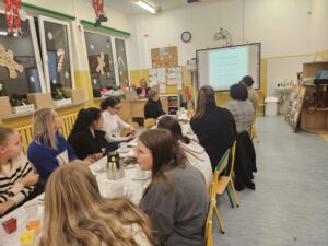 Po części oficjalnej przyszedł czas na swobodną integrację. W miłej atmosferze, przy herbatce i słodkościach, rozmawialiśmy, wymienialiśmy się doświadczeniami i wzmacnialiśmy nasze relacje.