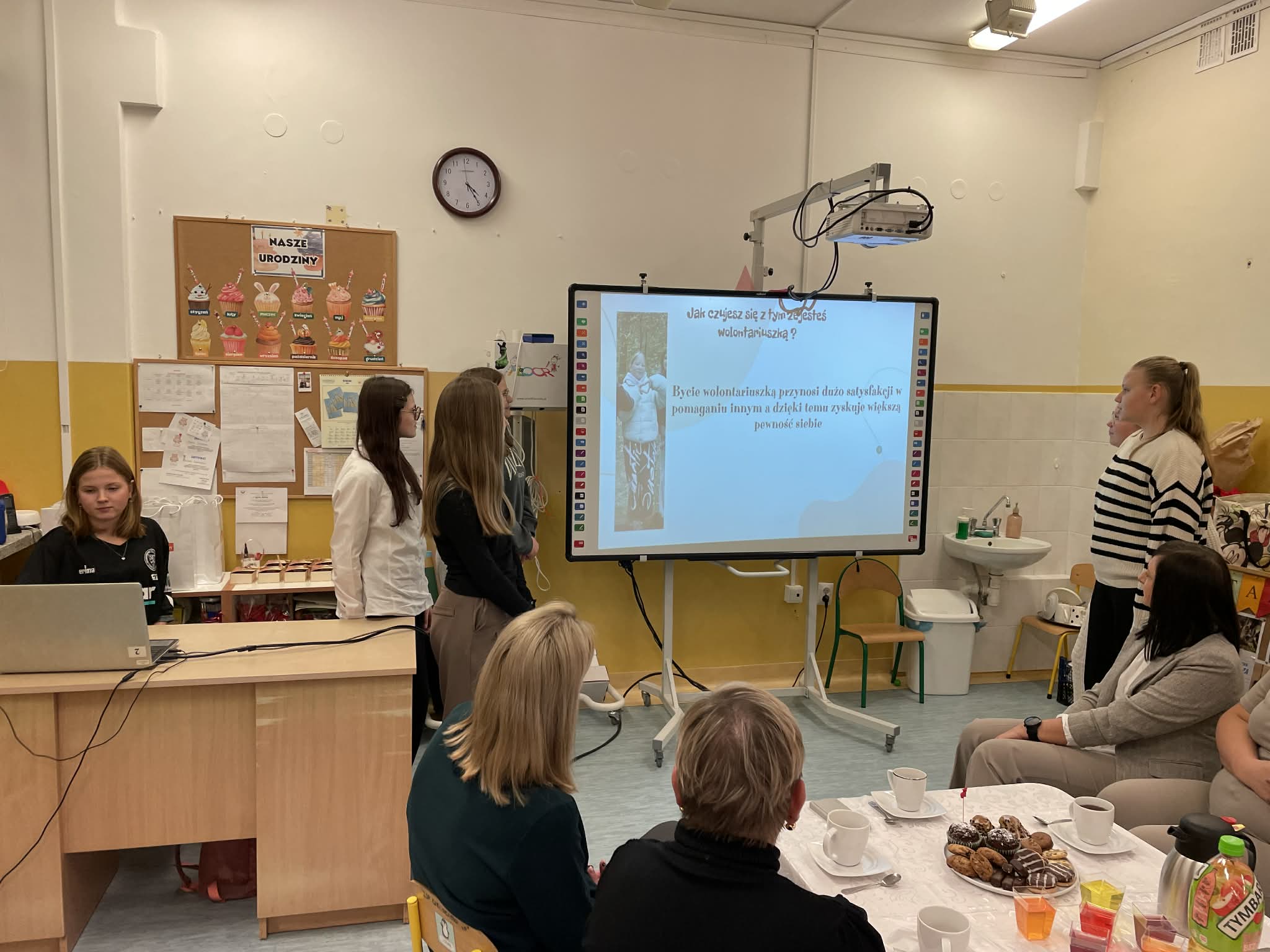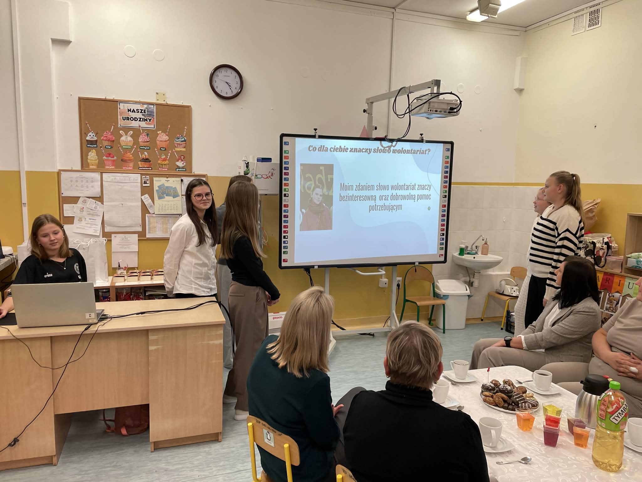 Spotkanie rozpoczęła opiekunka Szkolnego Koła Wolontariatu, która powitała zebranych oraz zaprezentowała prezentację dotyczącą działalności wolontariatu i podejmowanych przez nas inicjatyw. Następnie głos zabrały same wolontariuszki – przedstawiły swoją prezentację i podzieliły się refleksjami o tym, czym dla nich jest wolontariat.