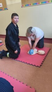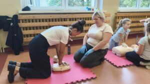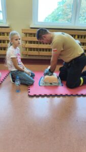 Strażacy z OSP Słajszewo i Sasino czuwali nad bezpieczeństwem i poprawnością wykonywanych czynności. Ich obecność dodała wydarzeniu wyjątkowego charakteru i sprawiła, że uczniowie mogli zobaczyć, jak wygląda praca ratownika w praktyce. To niezwykłe przedsięwzięcie pokazało, że nauka pierwszej pomocy może być świetną zabawą, ale przede wszystkim ważną lekcją odpowiedzialności i empatii. Każde dziecko, które wzięło udział w biciu rekordu, może być dumne – dziś wszyscy razem przyczyniliśmy się do promowania postaw ratujących życie.