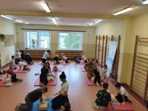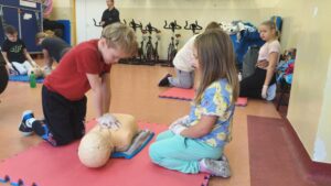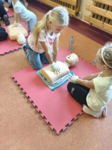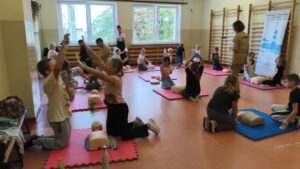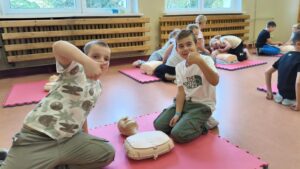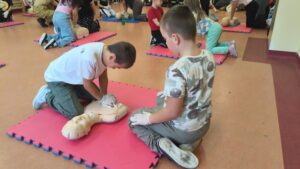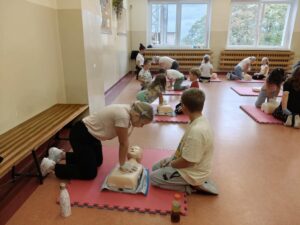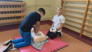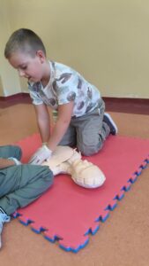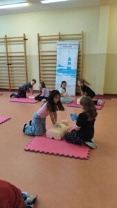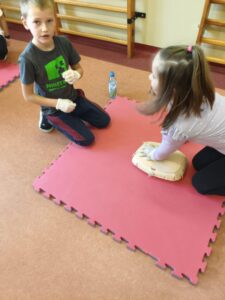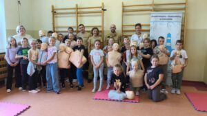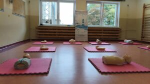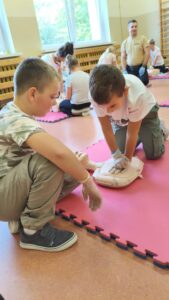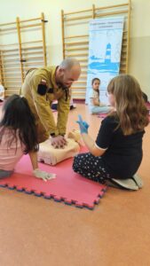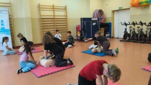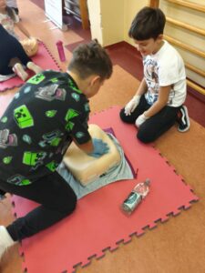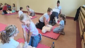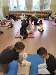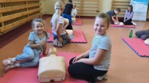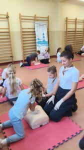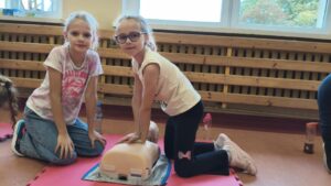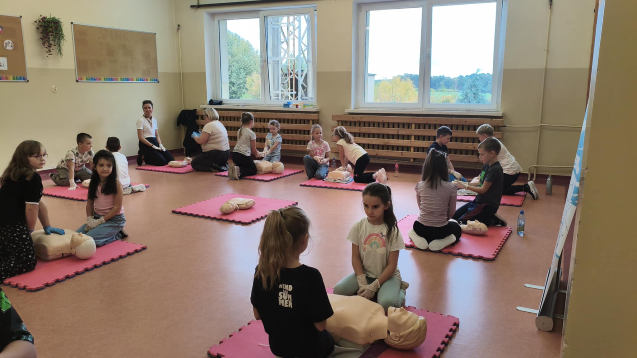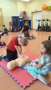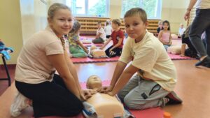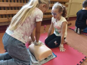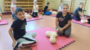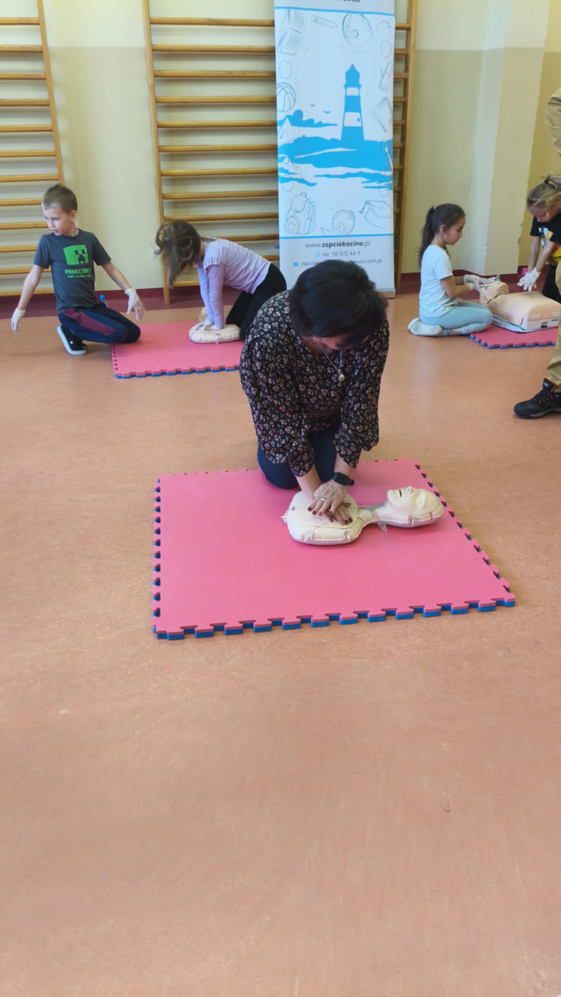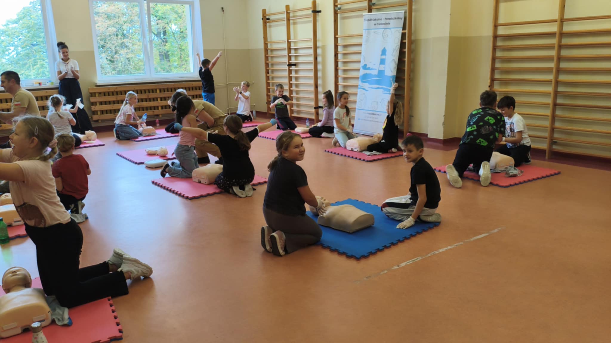 Dziś, w wyjątkowym dniu – Światowym Dniu Przywracania Czynności Serca – uczniowie klas I – III naszej szkoły wraz z wychowawcami oraz zaproszonymi gośćmi: strażakami z OSP Słajszewo i OSP Sasino, wzięli udział w ogólnopolskim wydarzeniu „Bicie Rekordu w Pierwszej Pomocy”, organizowanym w ramach programu Wielkiej Orkiestry Świątecznej Pomocy – „Ratujemy i Uczymy Ratować”. Celem akcji było promowanie idei udzielania pierwszej pomocy oraz budowanie świadomości wśród dzieci, jak ważne jest szybkie reagowanie w sytuacjach zagrożenia życia. Dzieci z ogromnym zaangażowaniem i ciekawością uczestniczyły w tym niezwykłym przedsięwzięciu, ucząc się podstawowych zasad resuscytacji krążeniowo- oddechowej. Na małej sali gimnastycznej przygotowano 13 stanowisk z manekinami, przy których pracowały dwuosobowe zespoły uczniów pod czujnym okiem nauczycieli i strażaków. Przez 30 minut wszyscy uczestnicy wykonywali uciski klatki piersiowej, wspólnie bijąc