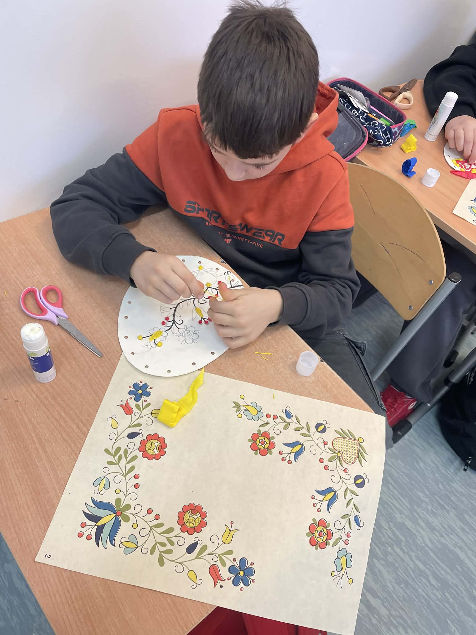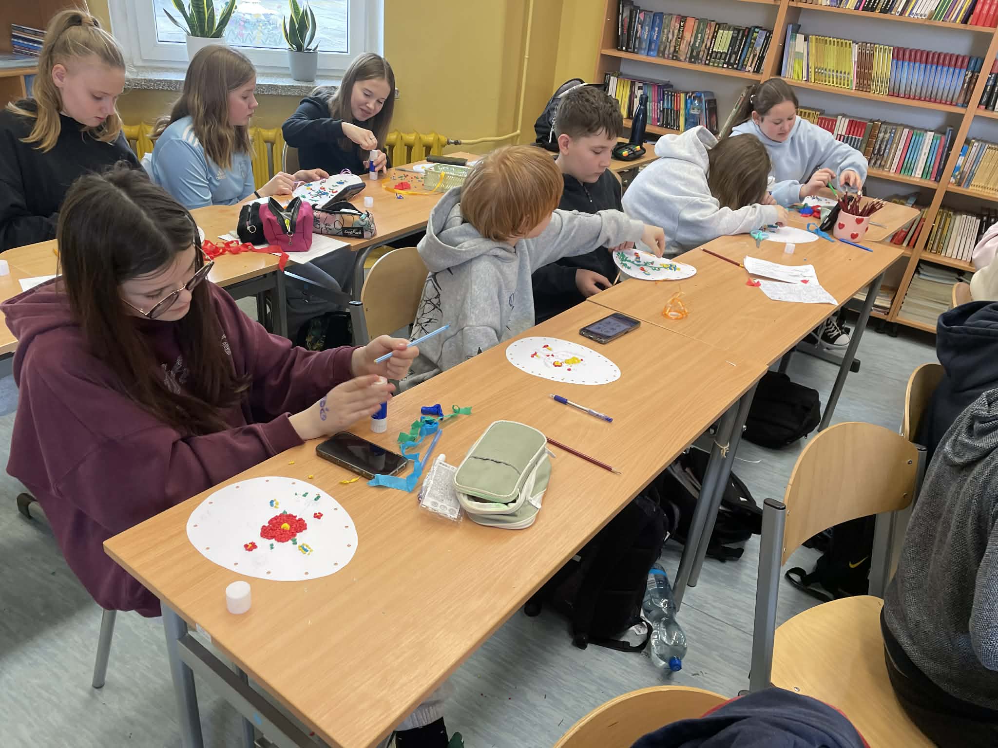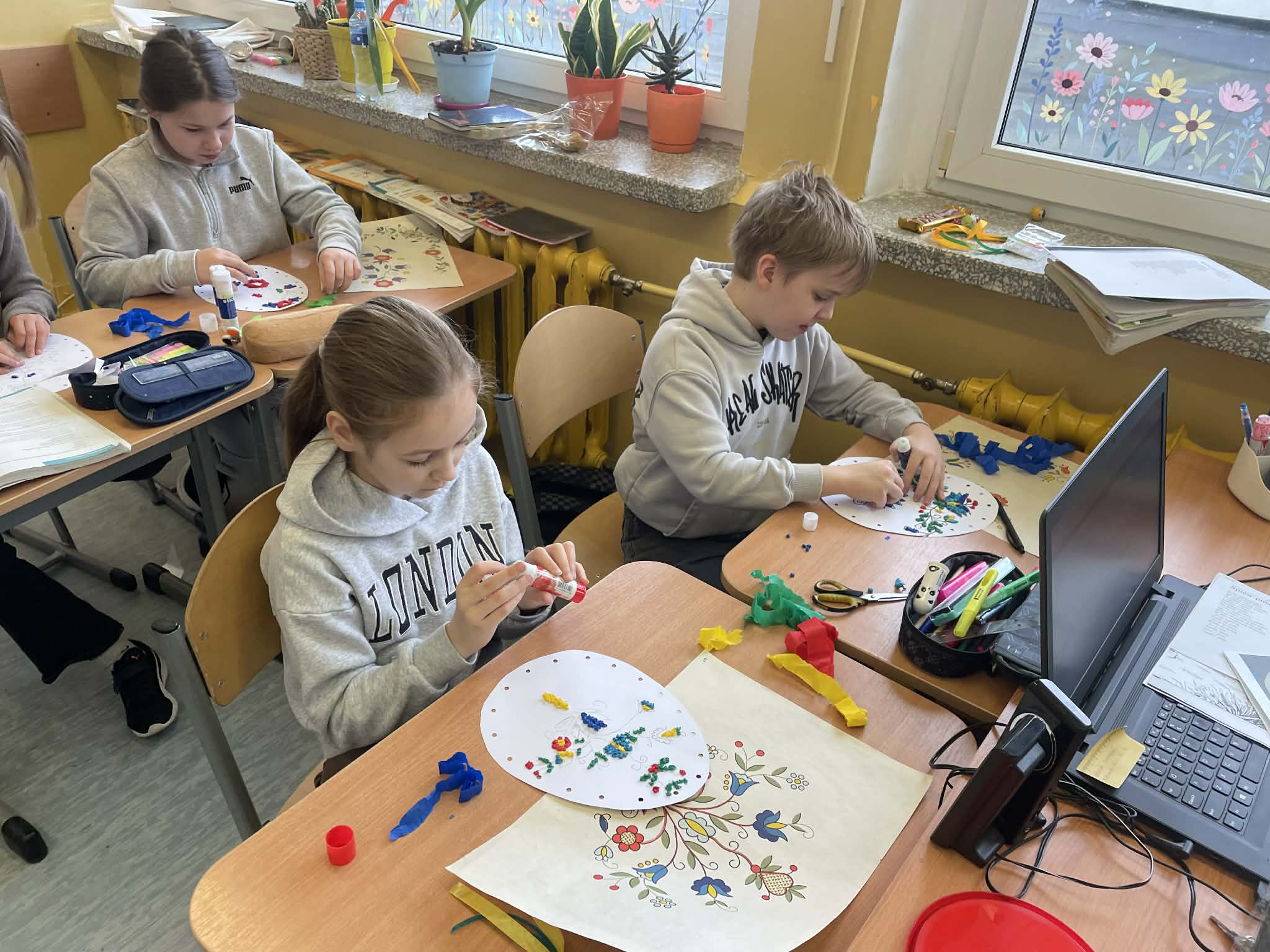 W ostatnich dniach przed przerwą świąteczną uczniowie klas 4–7 wzięli udział w niecodziennych zajęciach języka kaszubskiego, podczas których mieli okazję połączyć naukę z twórczą pracą manualną. Tematem spotkania były tradycje wielkanocne na Kaszubach, a głównym zadaniem – wykonanie pisanek techniką wyklejania.