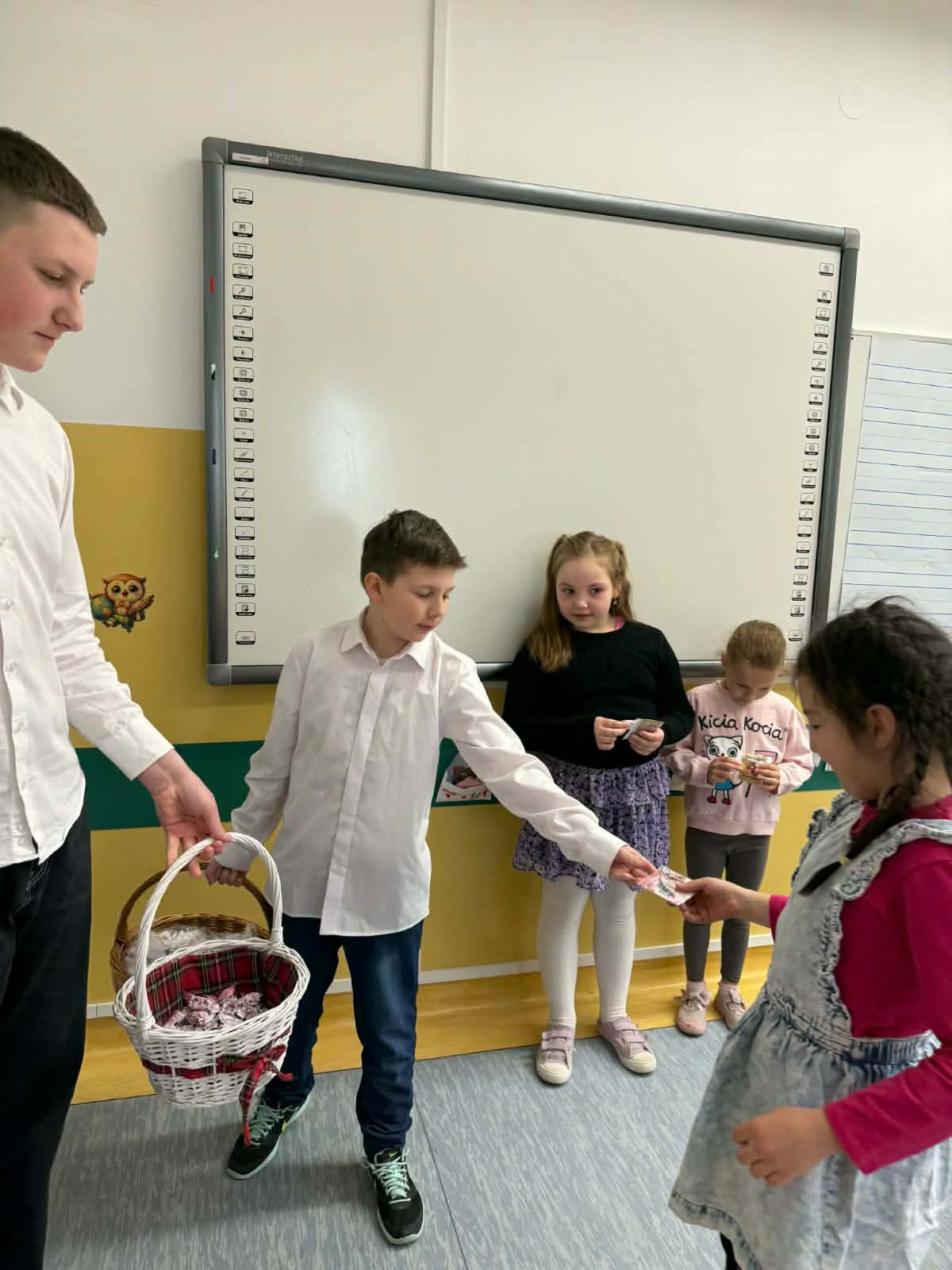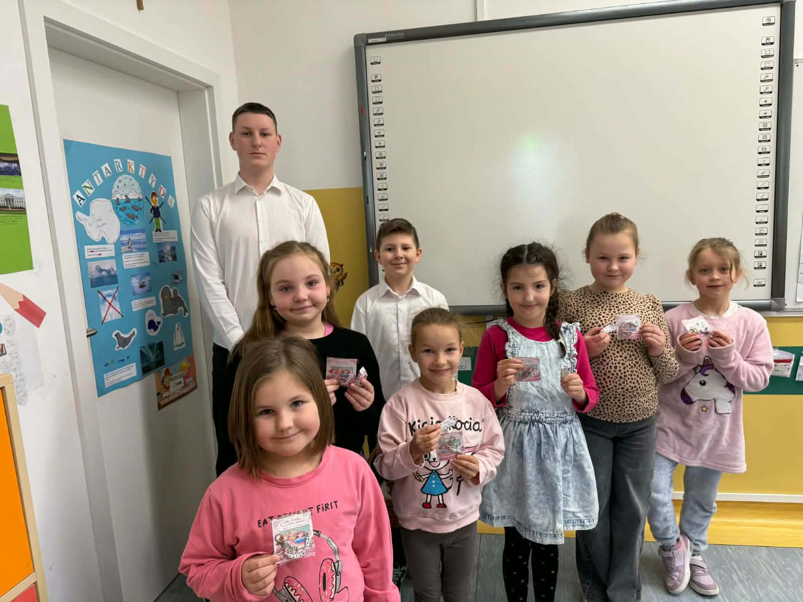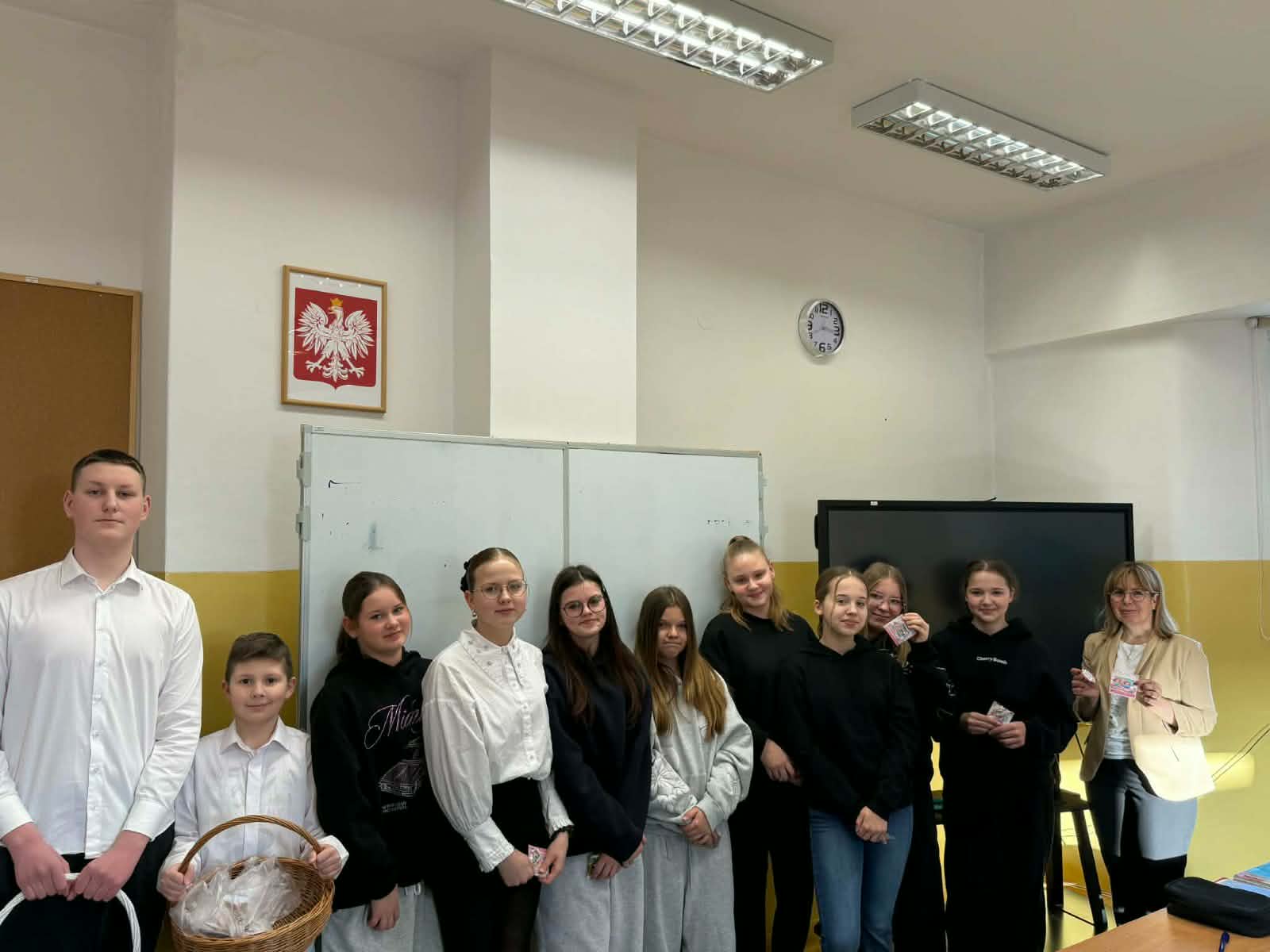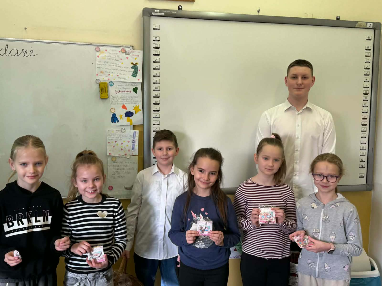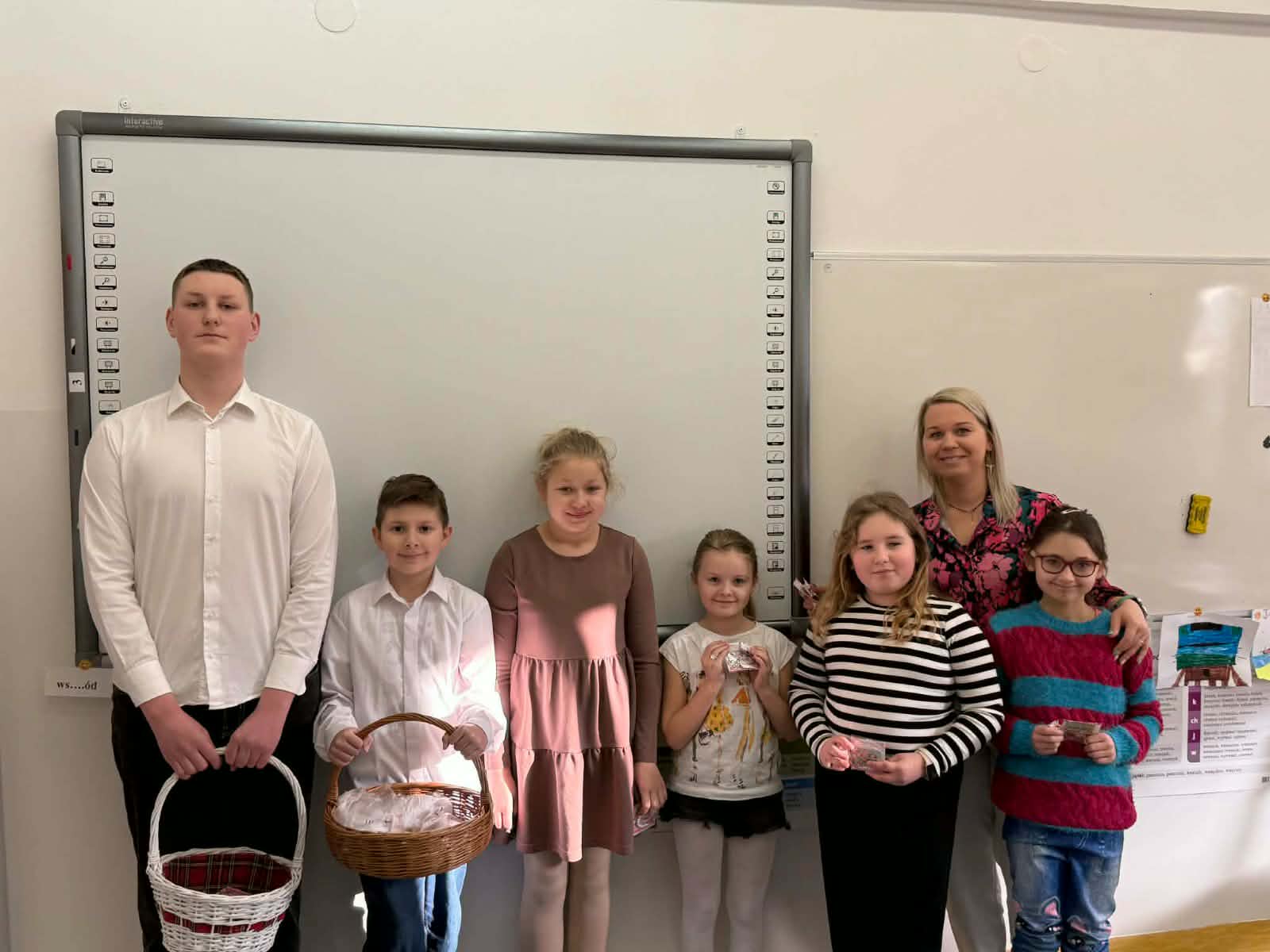 Panie – nasze dziewczynki otrzymały drobne upominki – breloczki z imieniem, piękne karteczki z życzeniami oraz słodkie cukierki z napisem „Słodkiego Dnia Kobiet”. W imieniu Samorządu Uczniowskiego przedstawiciele – Paweł, Hubert i Miłosz – złożyli wszystkim Paniom serdeczne życzenia, życząc wszystkiego najlepszego, dużo radości, zdrowia oraz wielu słonecznych dni. Ten miły gest sprawił wiele radości i wywołał uśmiechy na twarzach obdarowanych Pań.