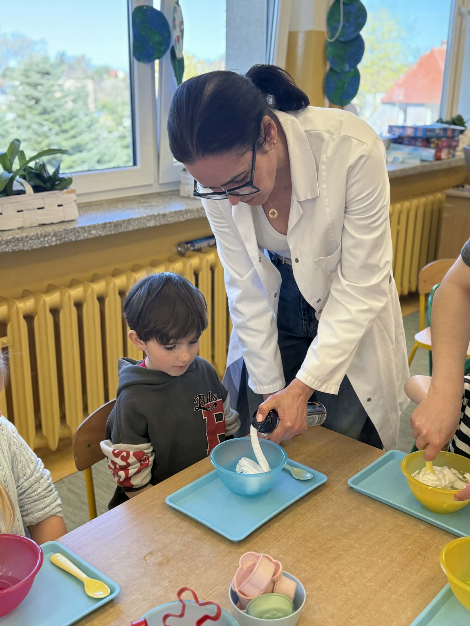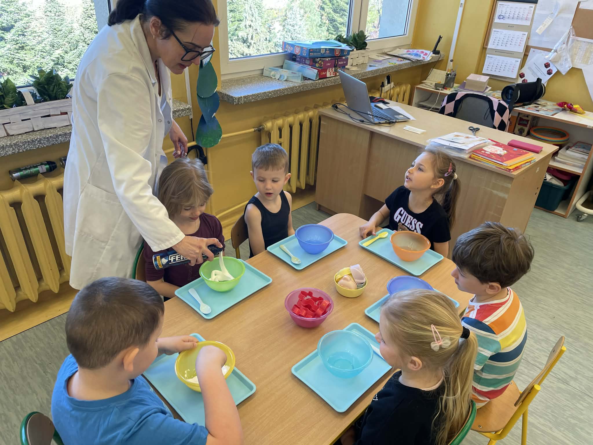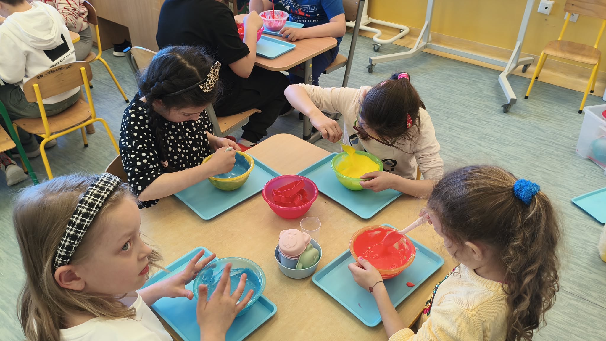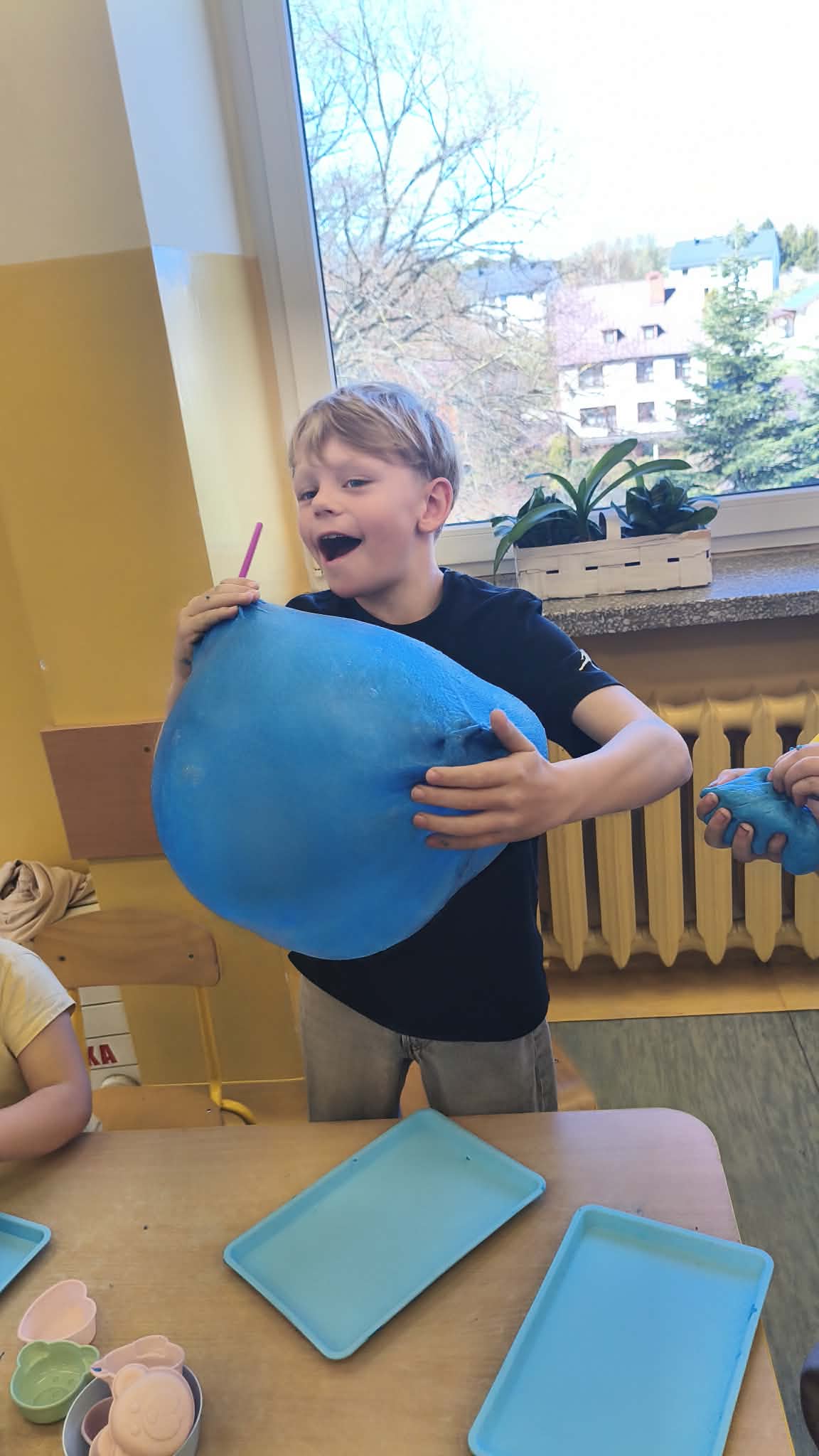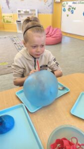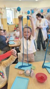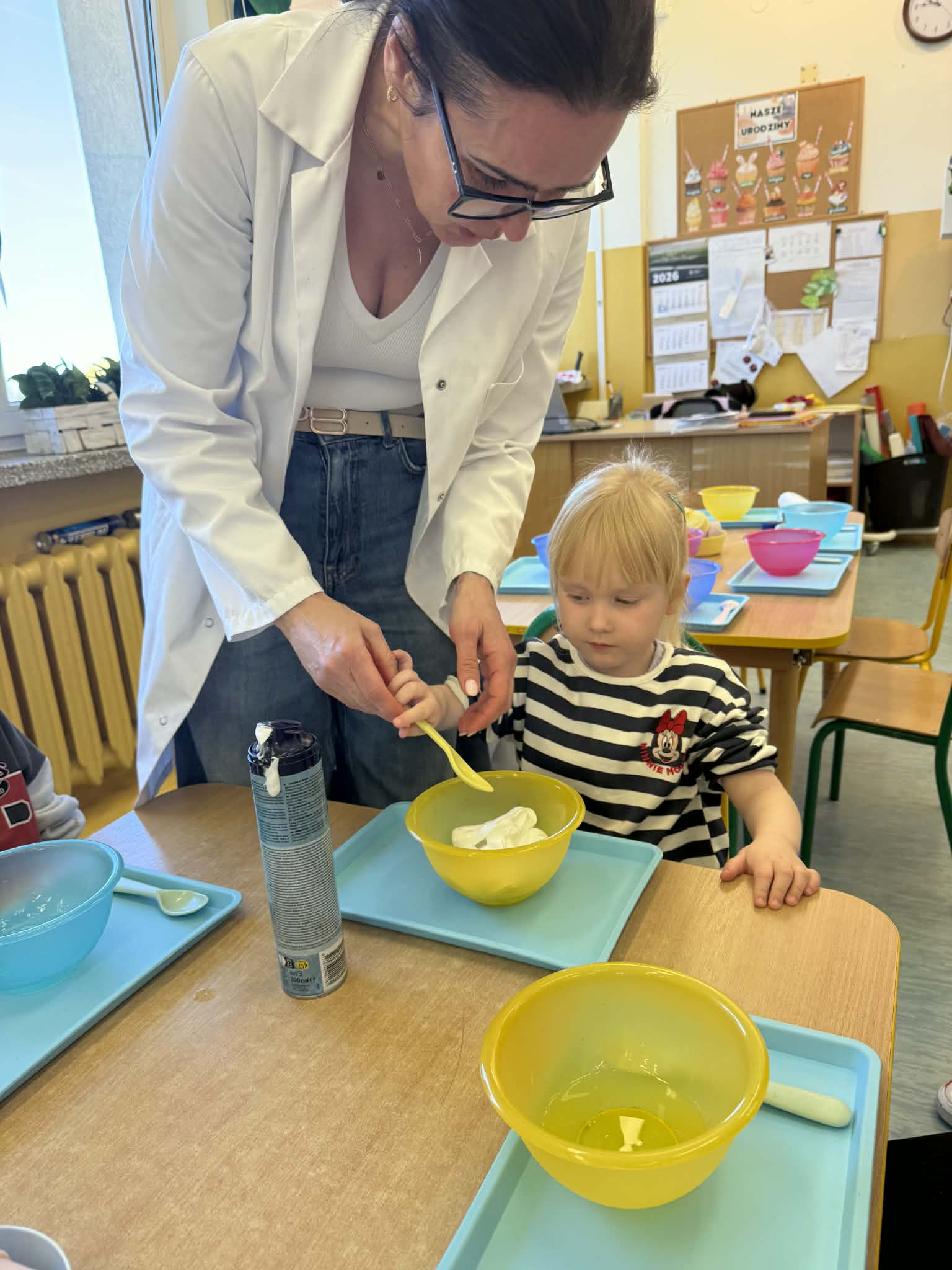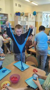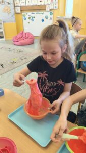 Największą atrakcją zajęć było samodzielne wykonywanie przez dzieci ekologicznego slime’u. Uczestnicy mogli eksperymentować, obserwować zmiany zachodzące w substancjach oraz przekonać się, jak w praktyce działają poznane wcześniej zjawiska. Warsztaty nie tylko rozwijały ciekawość poznawczą, ale również kształtowały świadomość ekologiczną najmłodszych.