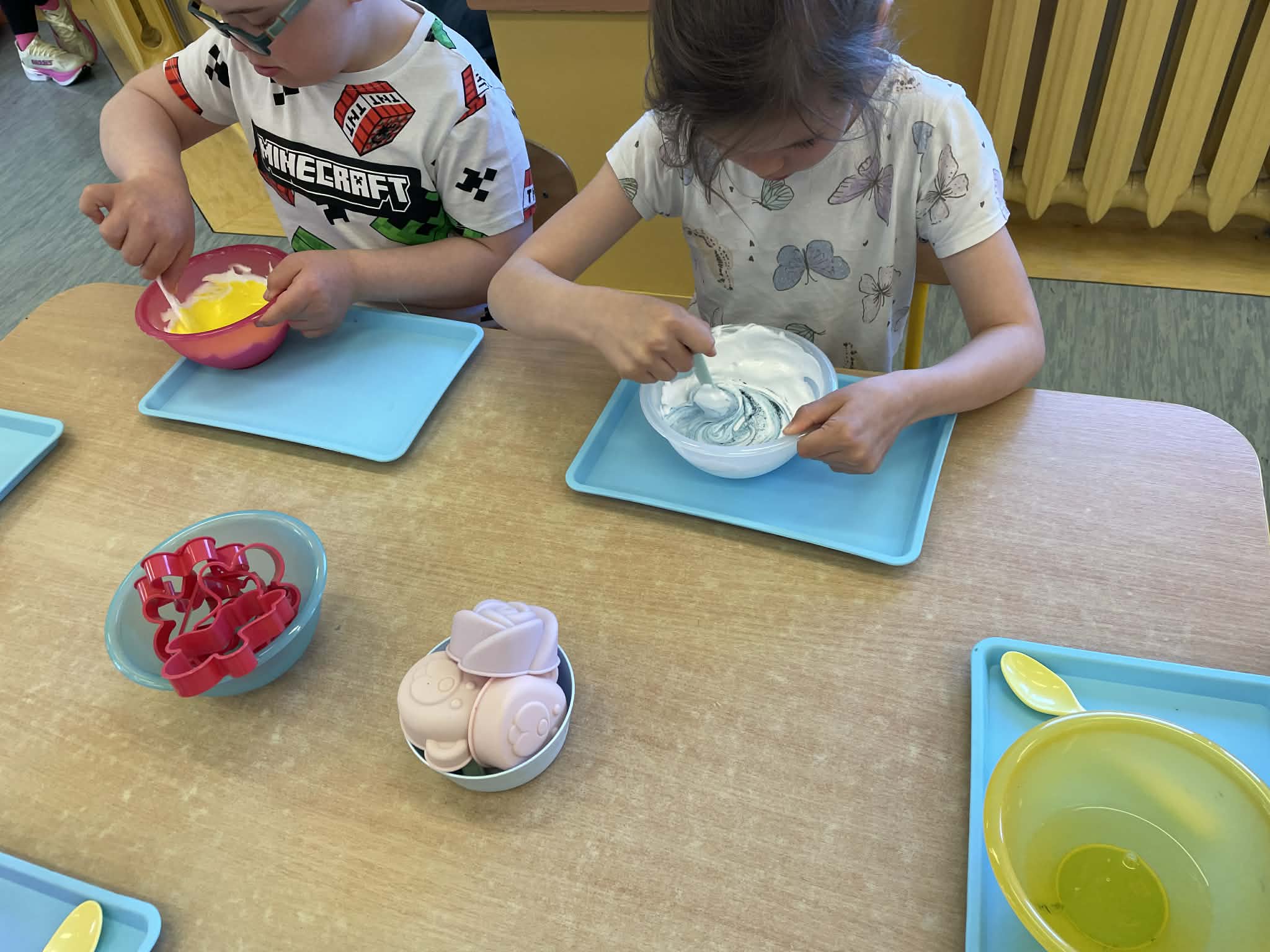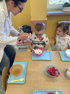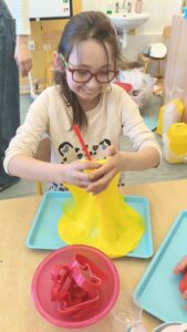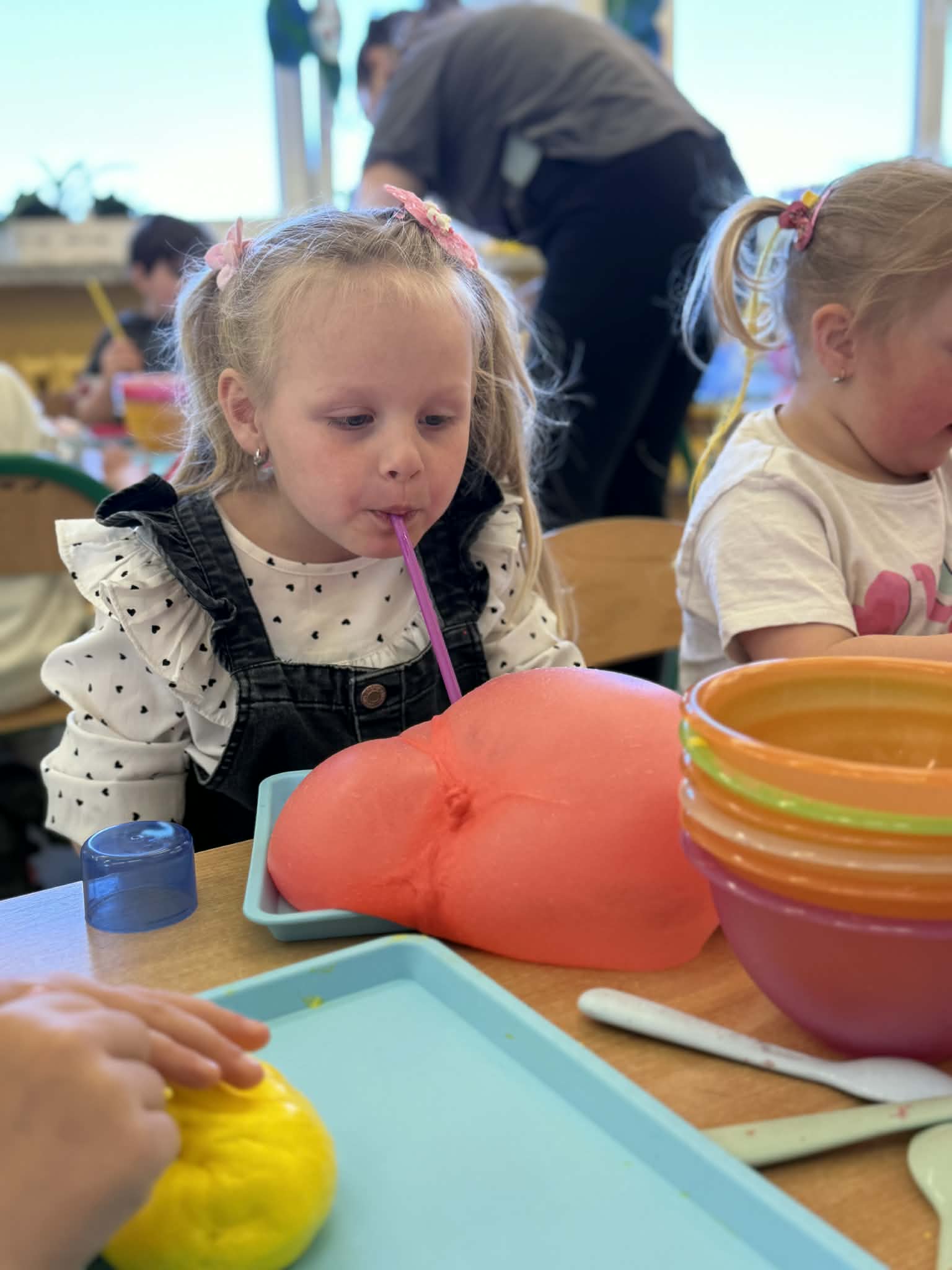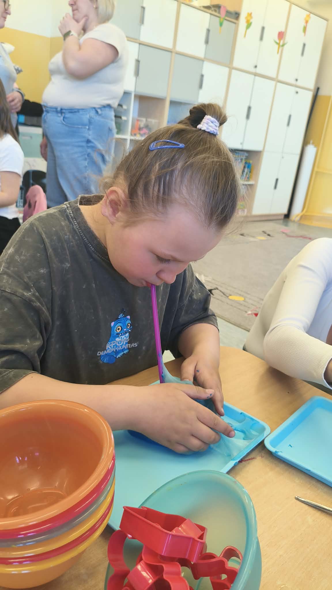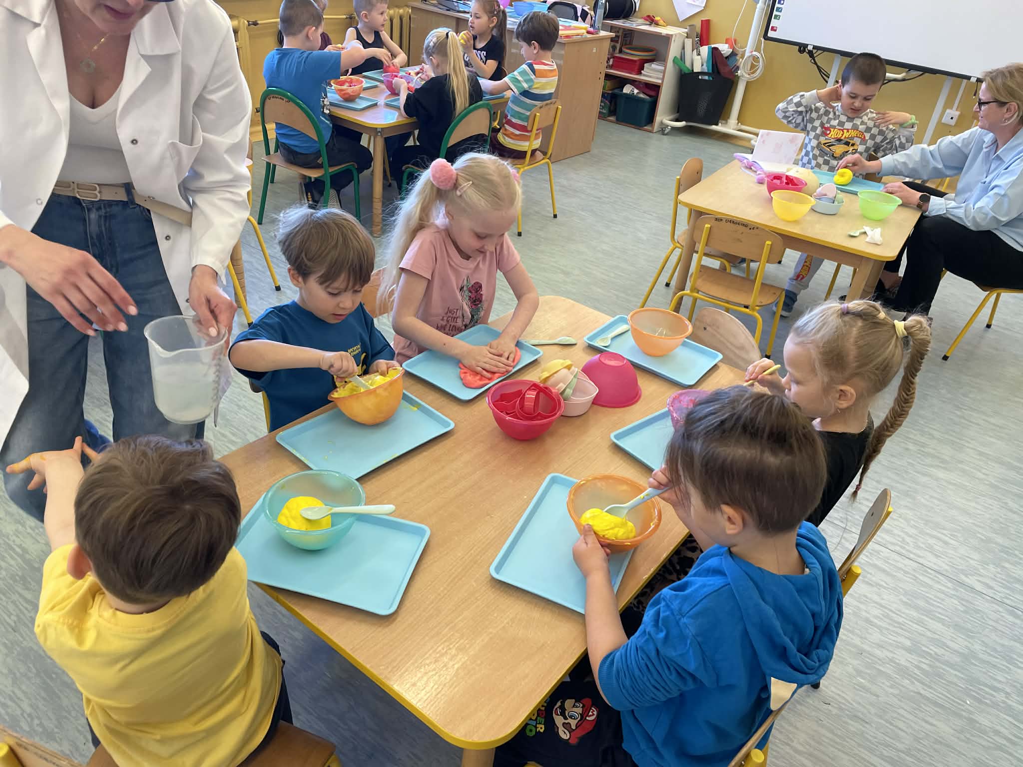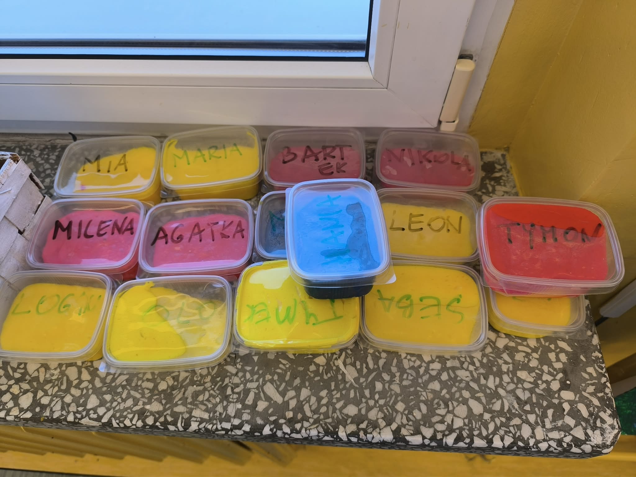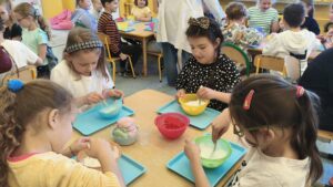 Największą atrakcją zajęć było samodzielne wykonywanie przez dzieci ekologicznego slime’u. Uczestnicy mogli eksperymentować, obserwować zmiany zachodzące w substancjach oraz przekonać się, jak w praktyce działają poznane wcześniej zjawiska. Warsztaty nie tylko rozwijały ciekawość poznawczą, ale również kształtowały świadomość ekologiczną najmłodszych.