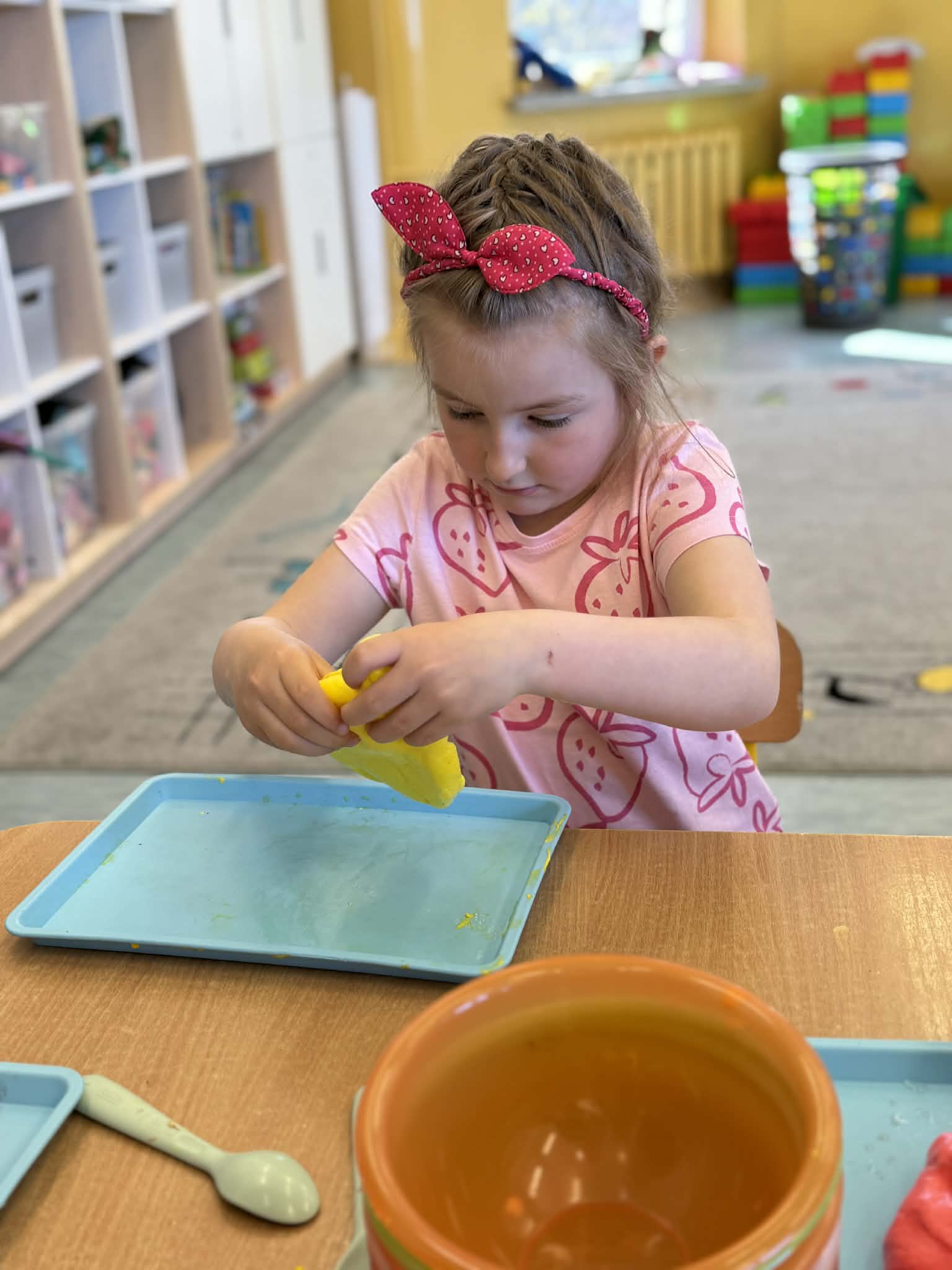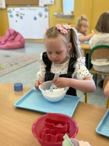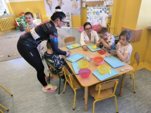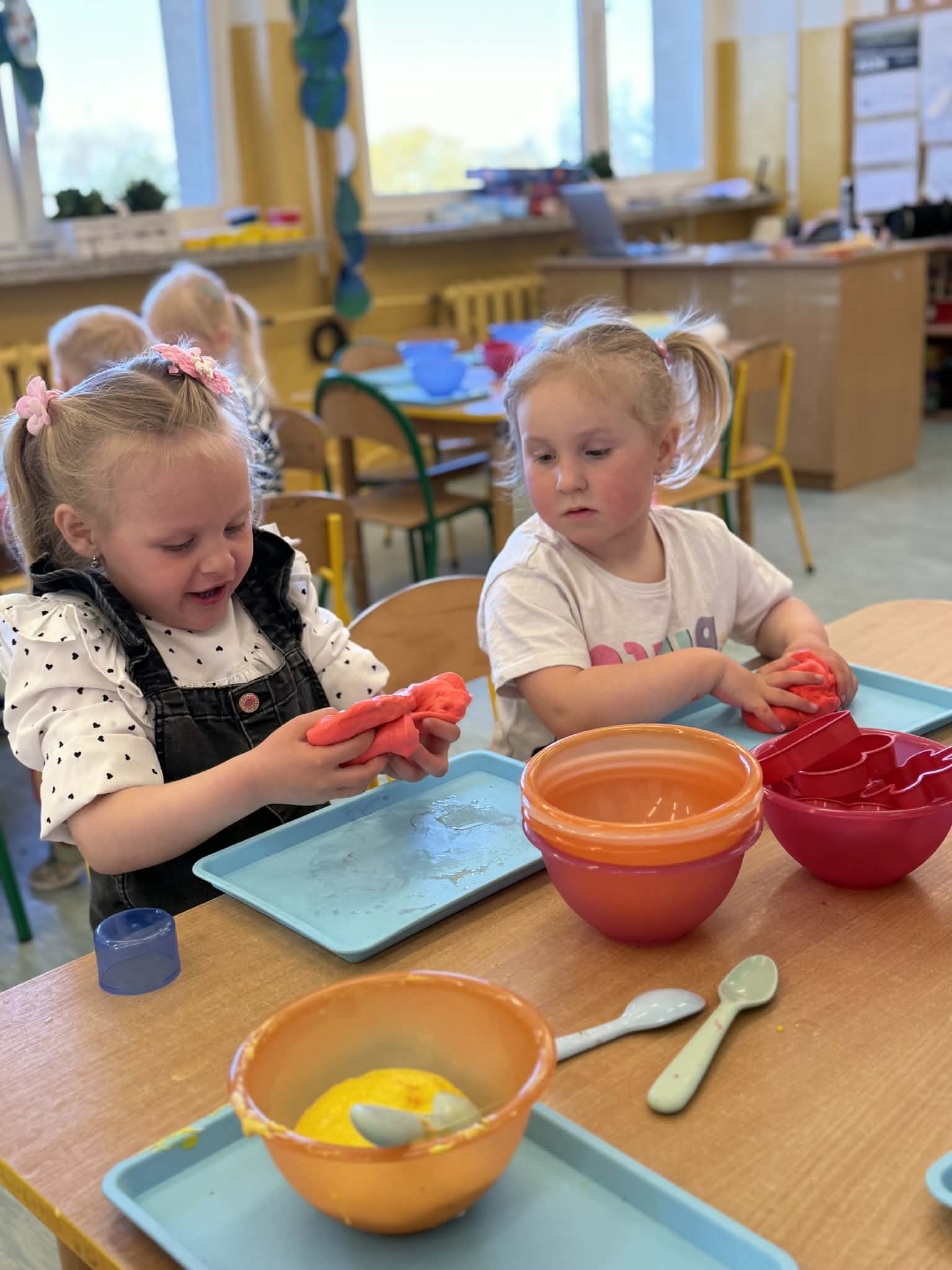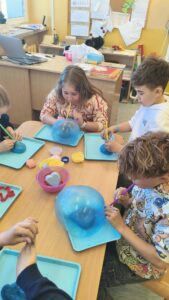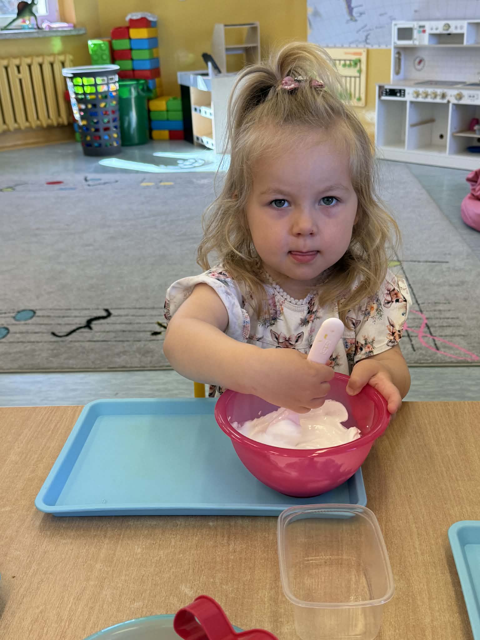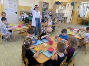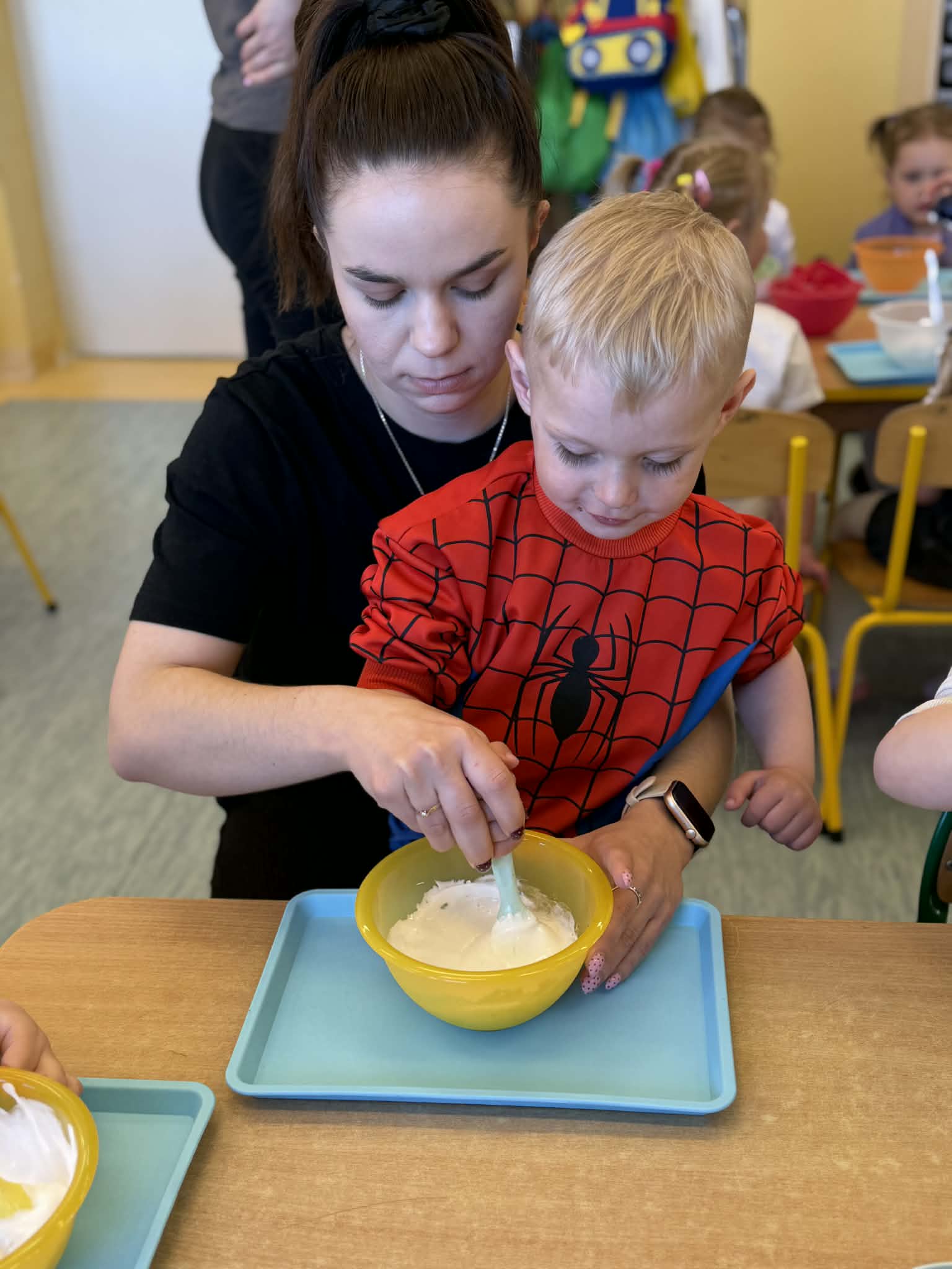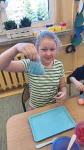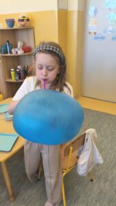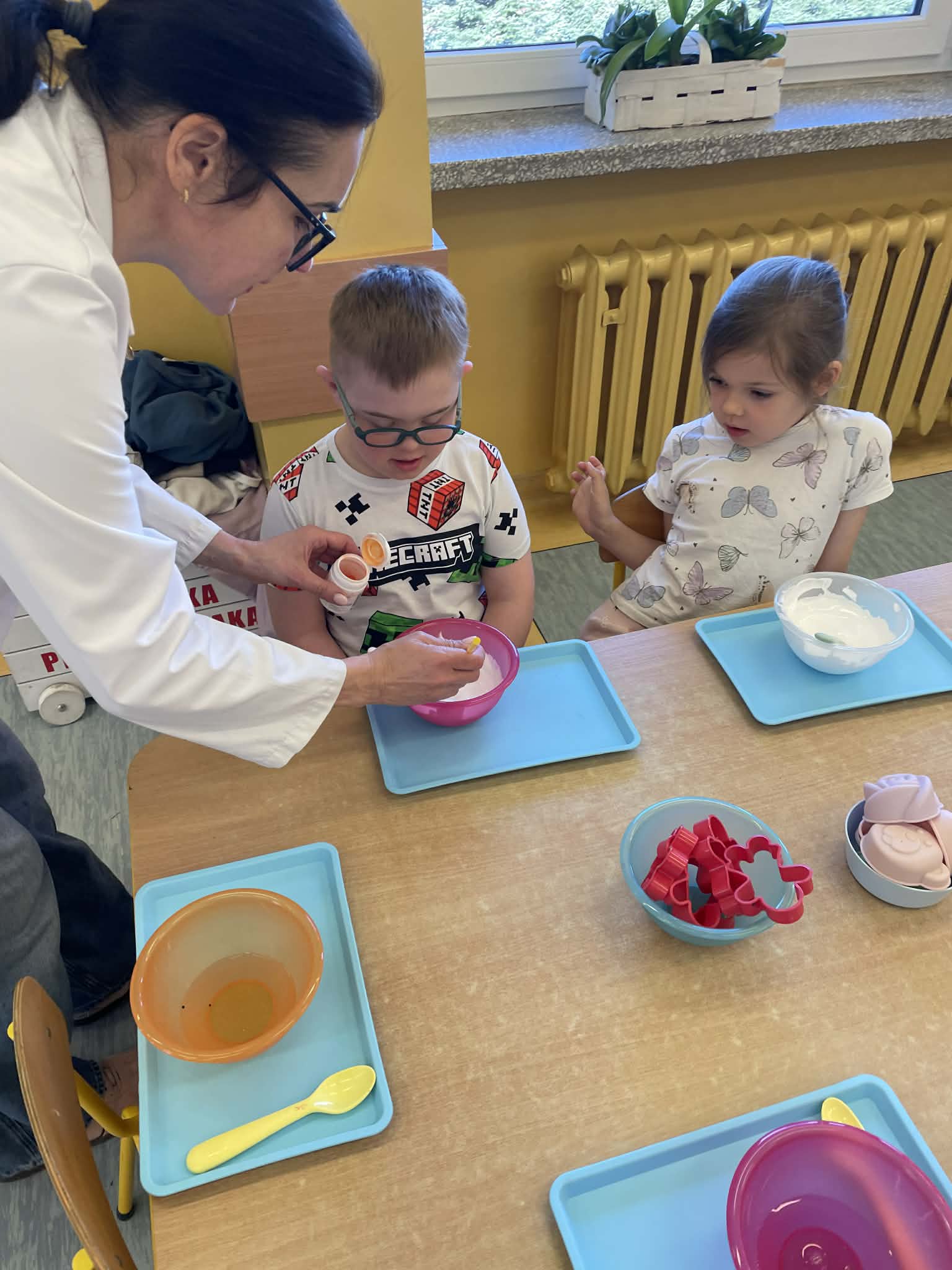 Największą atrakcją zajęć było samodzielne wykonywanie przez dzieci ekologicznego slime’u. Uczestnicy mogli eksperymentować, obserwować zmiany zachodzące w substancjach oraz przekonać się, jak w praktyce działają poznane wcześniej zjawiska. Warsztaty nie tylko rozwijały ciekawość poznawczą, ale również kształtowały świadomość ekologiczną najmłodszych.