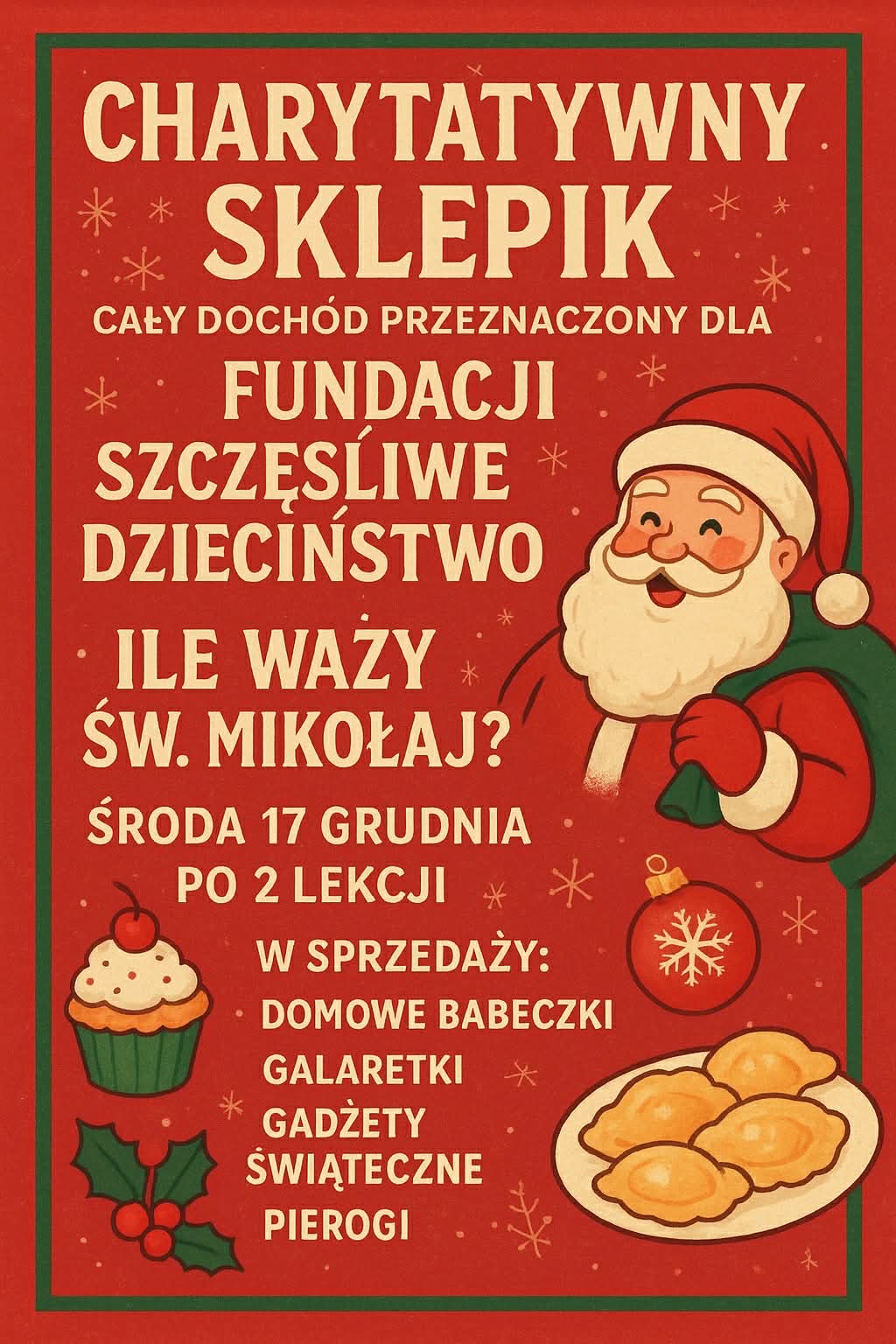Dodatkowo, aby jeszcze bardziej wesprzeć akcję, zorganizowaliśmy świąteczny sklepik szkolny. Można było w nim zakupić drobne upominki, ozdoby, pierogi, krokiety, barszcz czerwony oraz świąteczne smakołyki, przygotowane z dużym zaangażowaniem i sercem. Cały dochód ze sprzedaży został w całości przekazany na zbiórkę w ramach akcji „Ile waży św. Mikołaj”.
