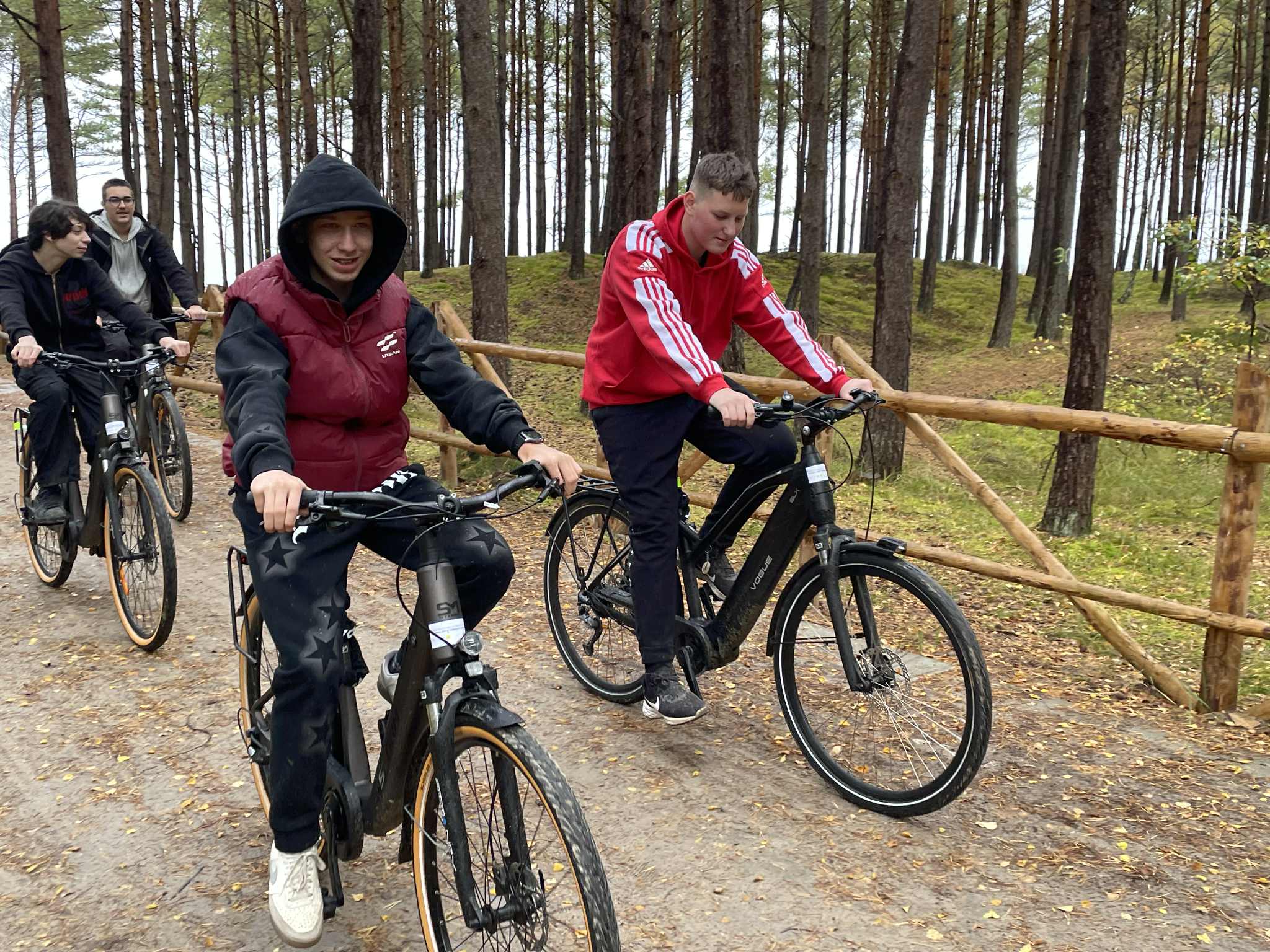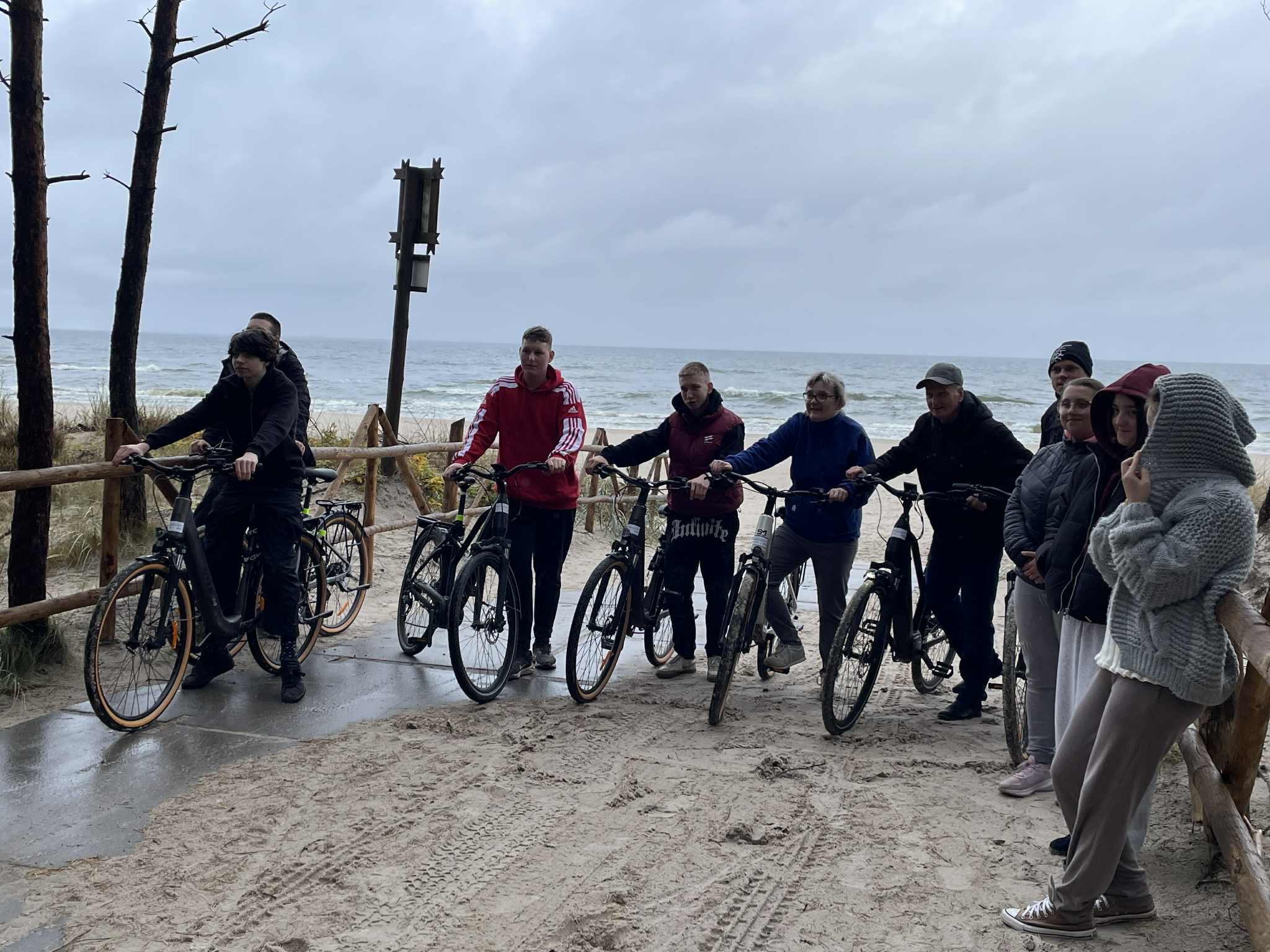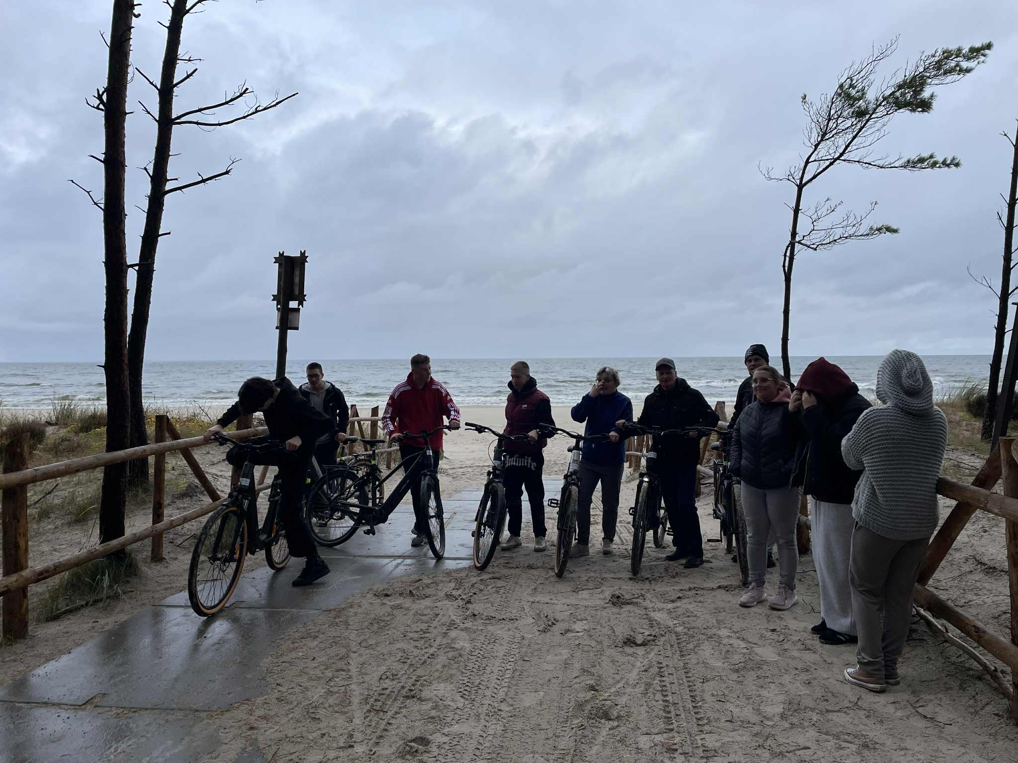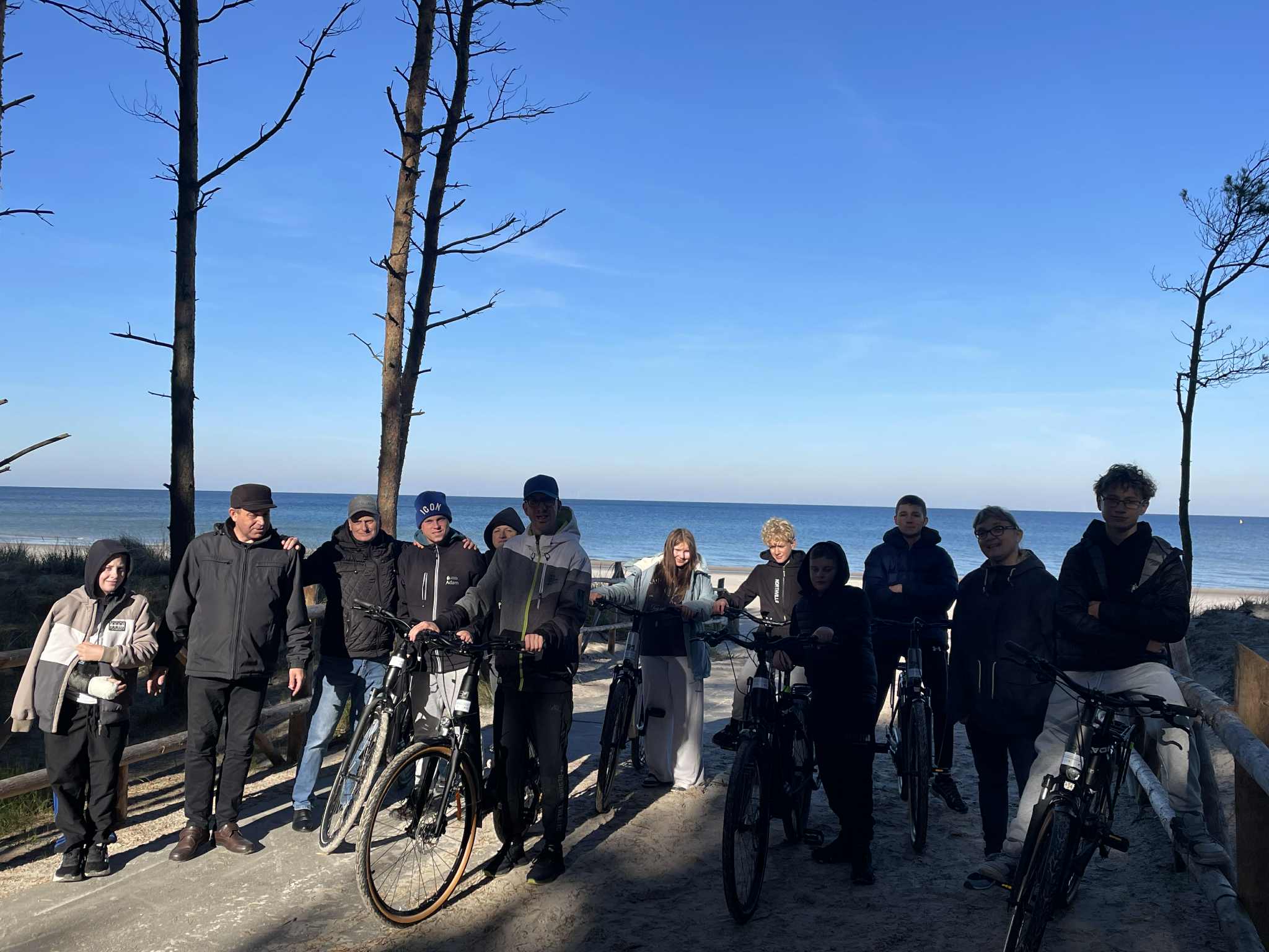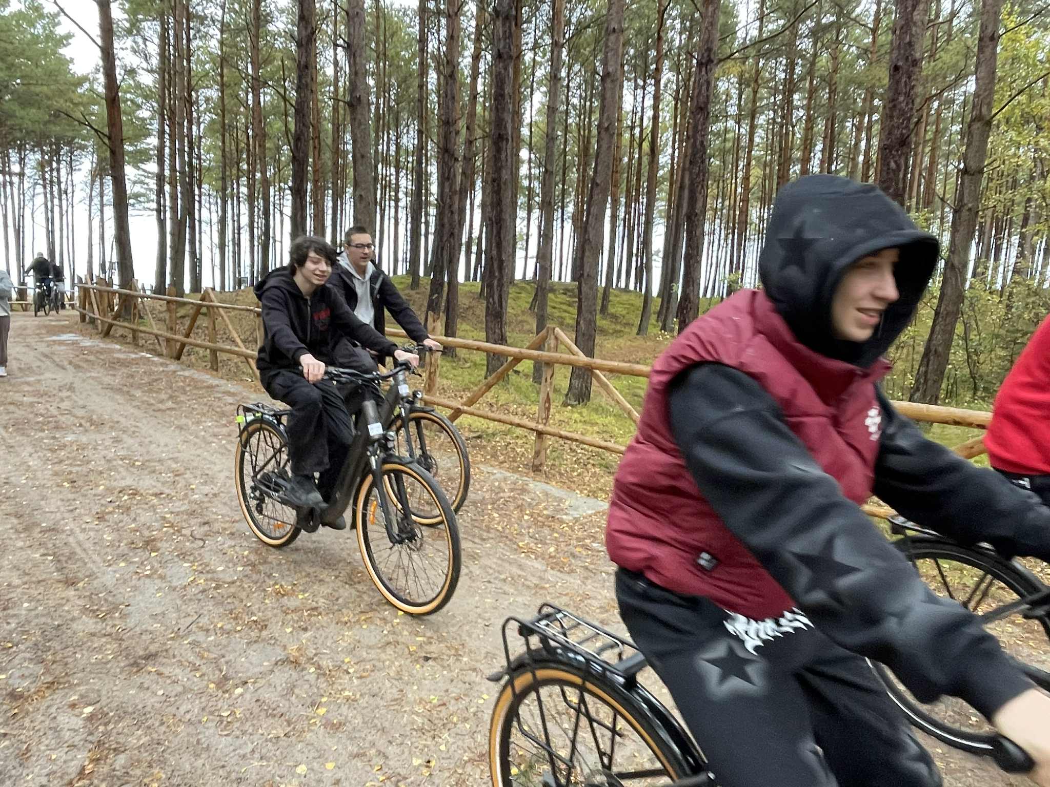 Po części teoretycznej przyszedł czas na praktykę! Uczniowie wraz z podopiecznymi ośrodka ruszyli na wspólną przejażdżkę rowerami elektrycznymi po lesie i nad morze. To była świetna okazja, by w bezpośrednim kontakcie przekonać się, jak działają te pojazdy i jak wiele radości mogą przynieść wspólne aktywności na świeżym powietrzu.