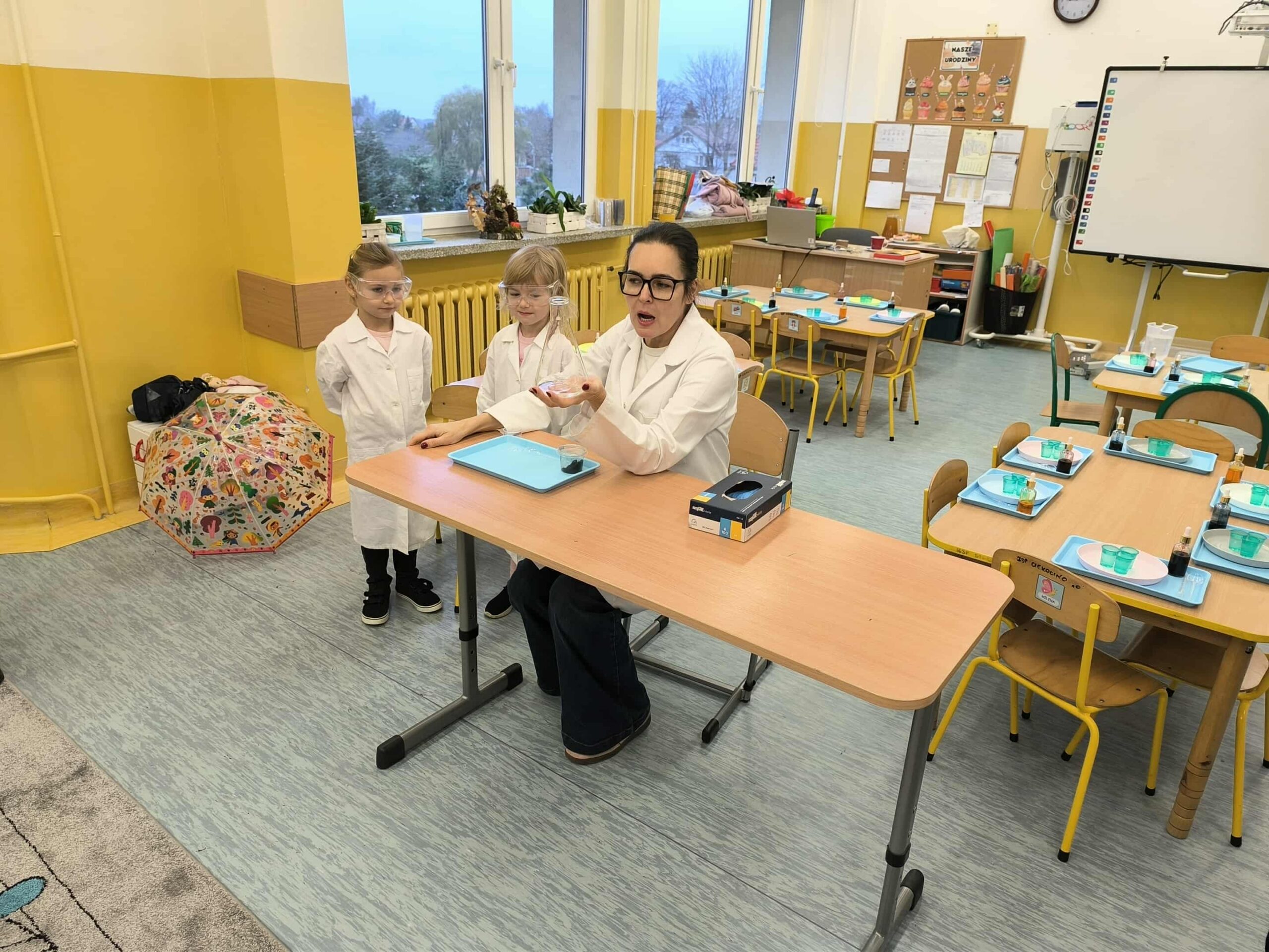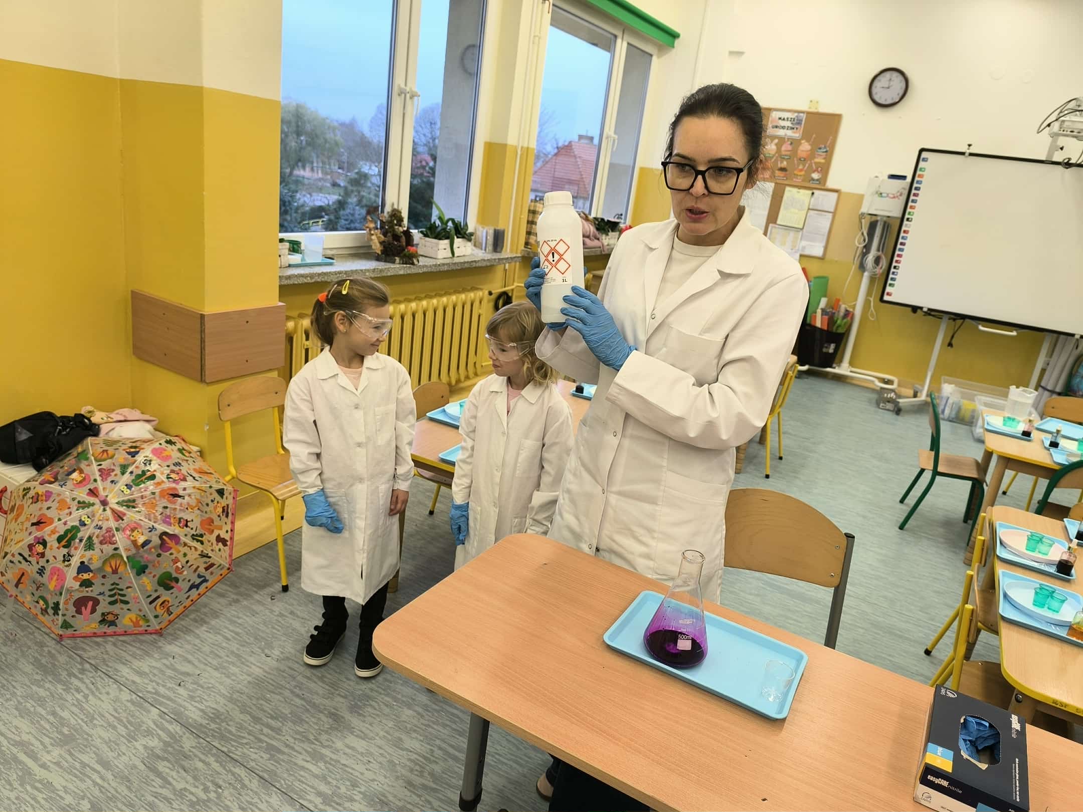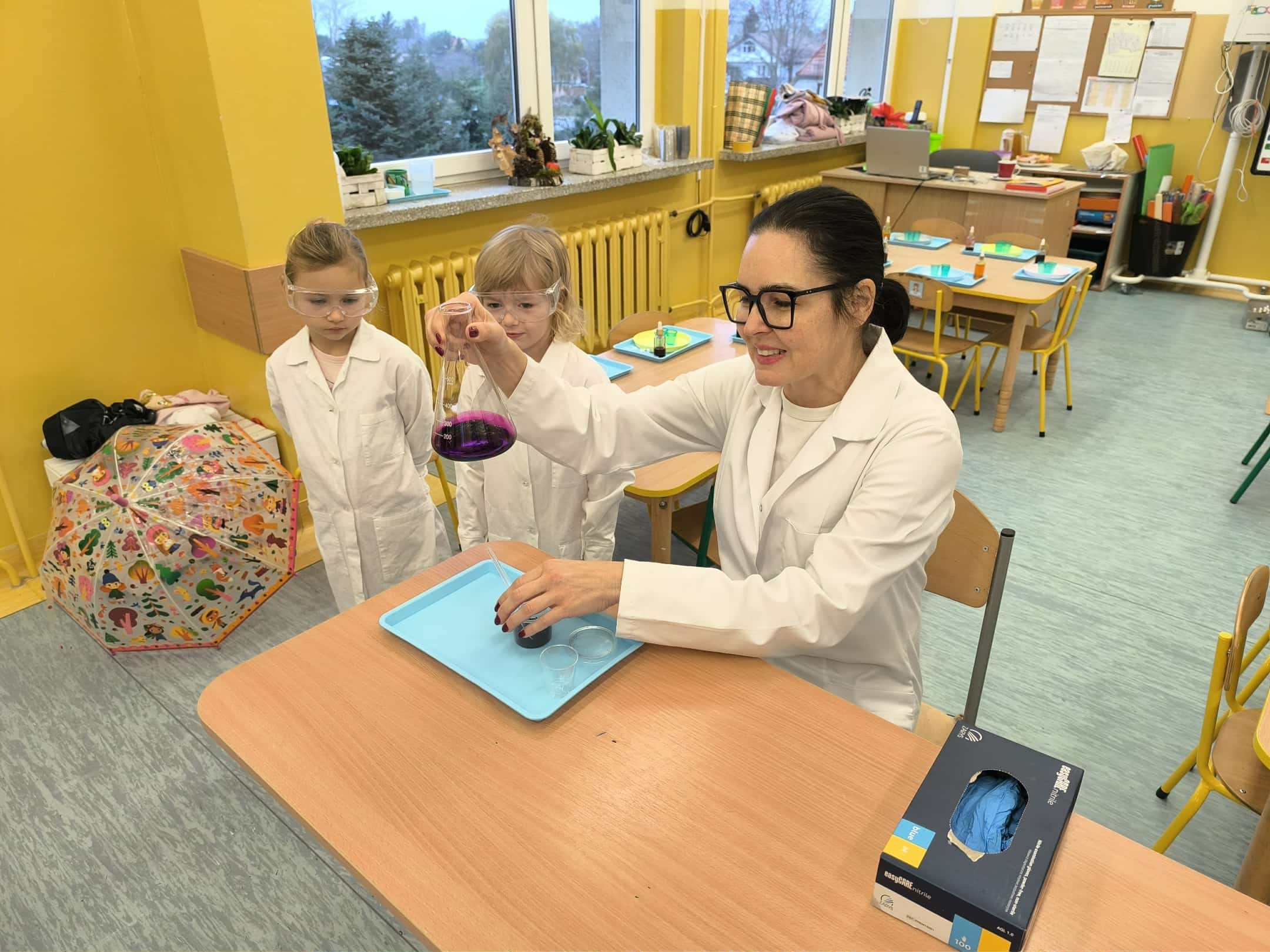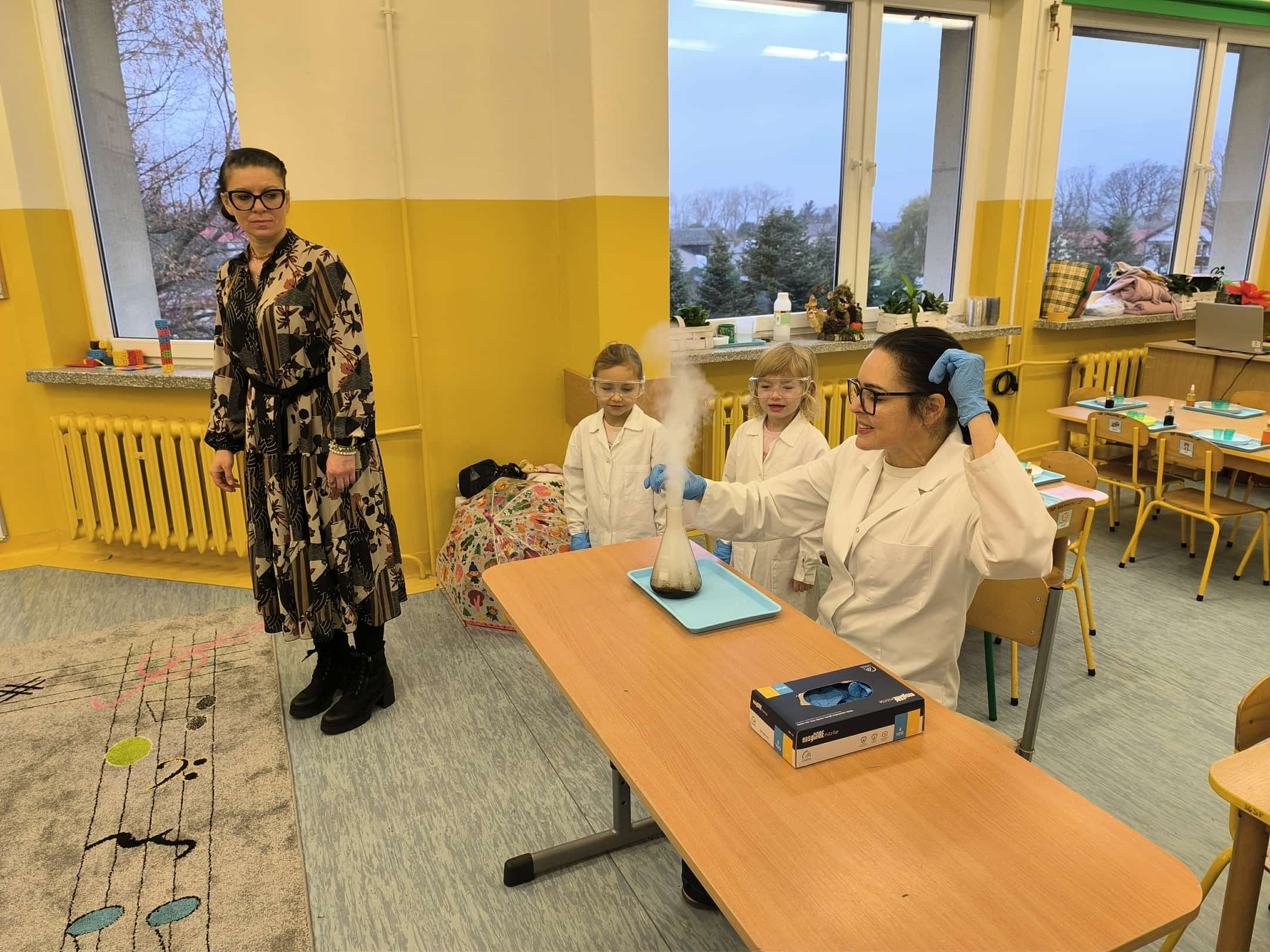 W środę, 20 listopada, w naszym przedszkolu oraz w klasach 0–3 odbyły się wyjątkowe warsztaty edukacyjne „Laboratorium Małego Chemika”, prowadzone przez firmę Logosfera. Spotkanie pełne barwnych doświadczeń i fascynujących eksperymentów przeniosło dzieci w świat nauki, pobudziło ich ciekawość oraz pokazało, że chemia może być niezwykle interesująca – i całkowicie bezpieczna.