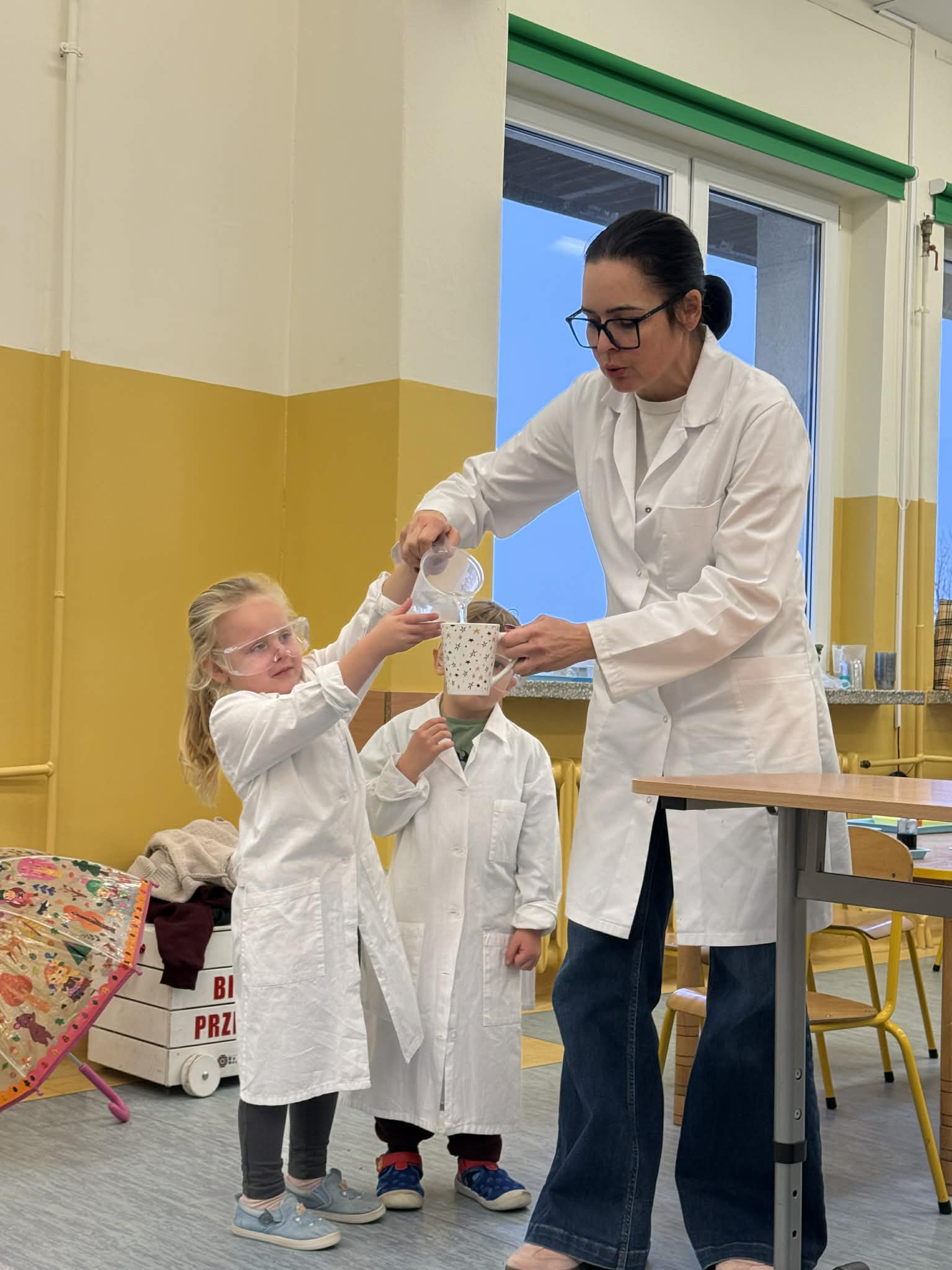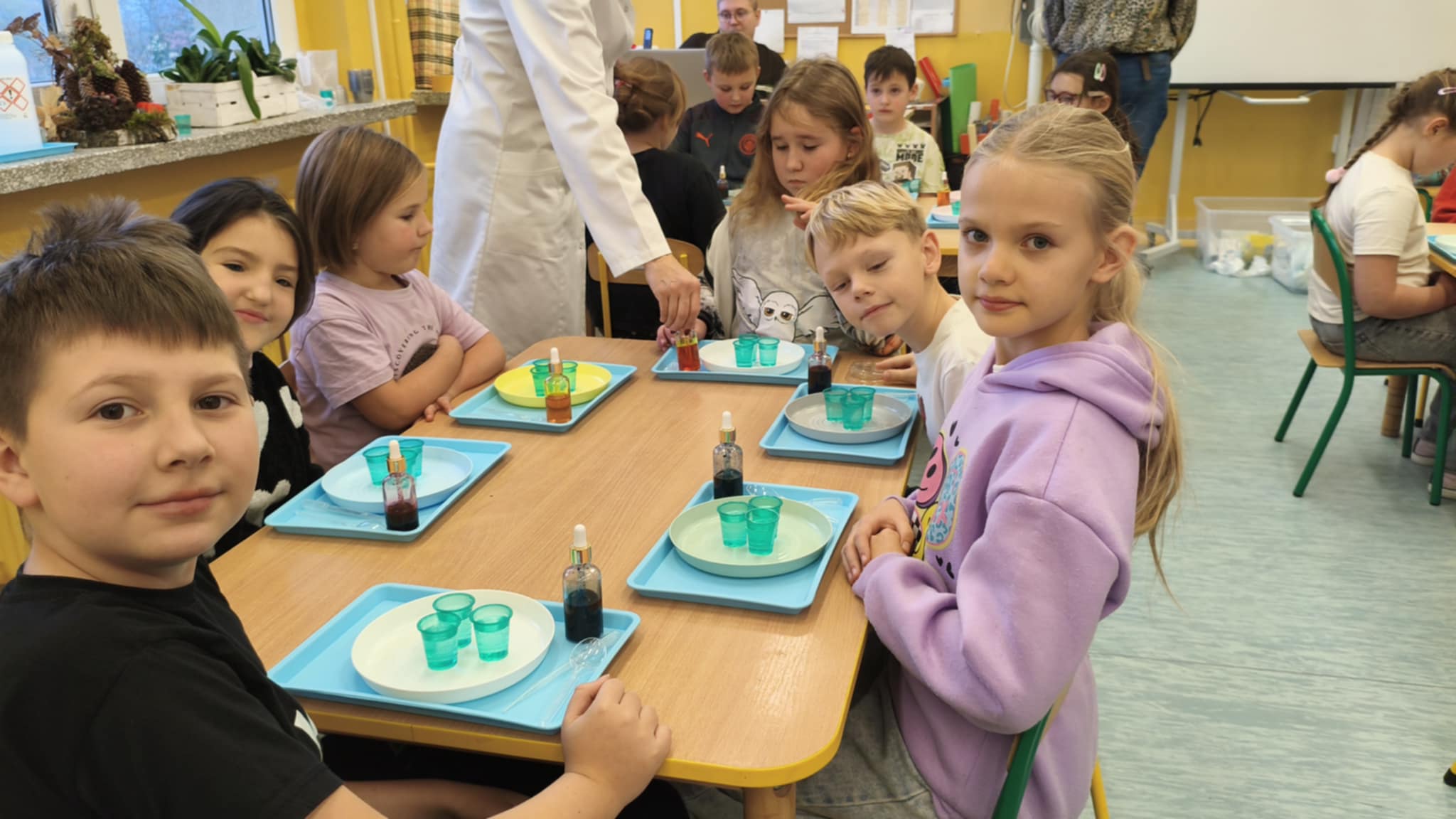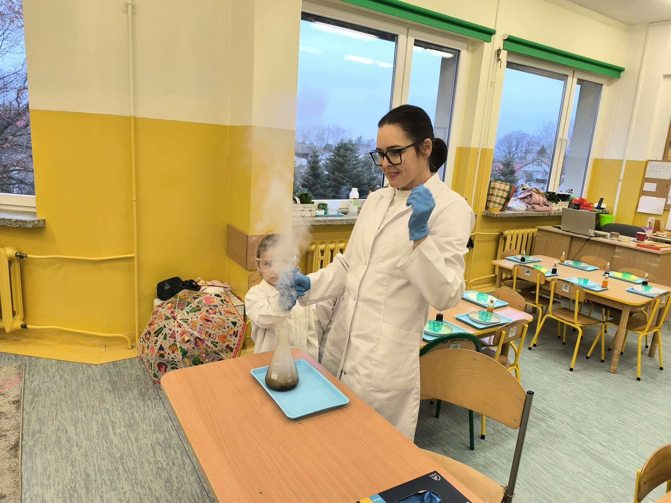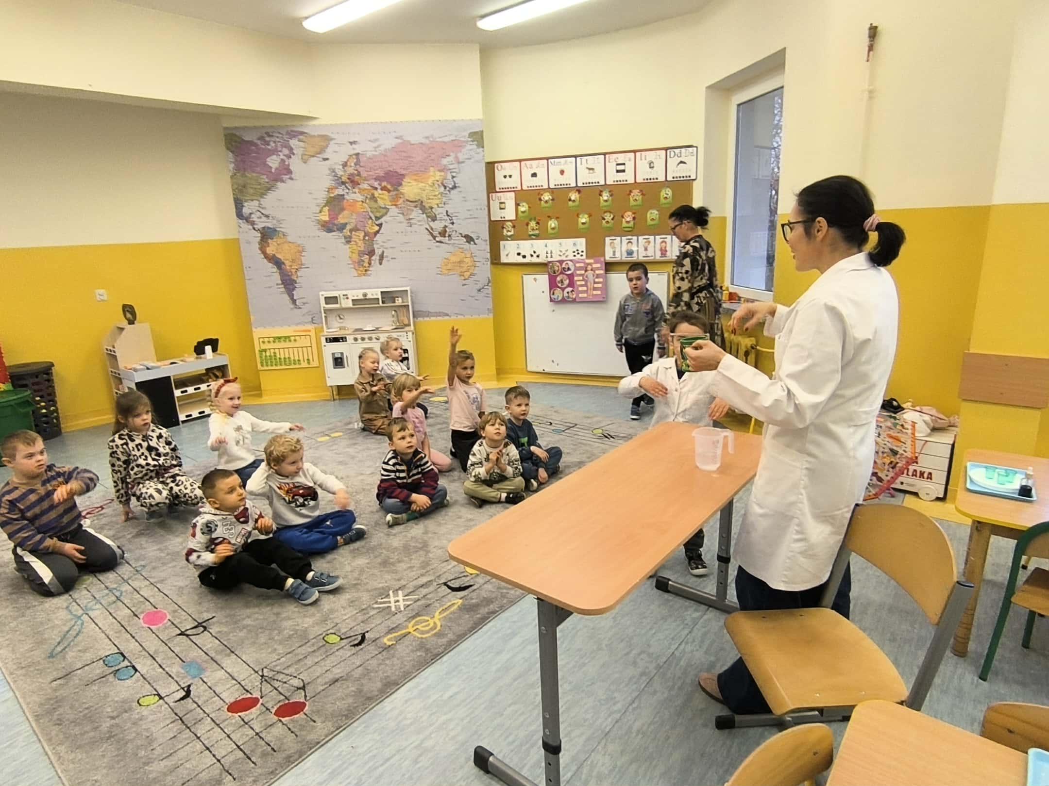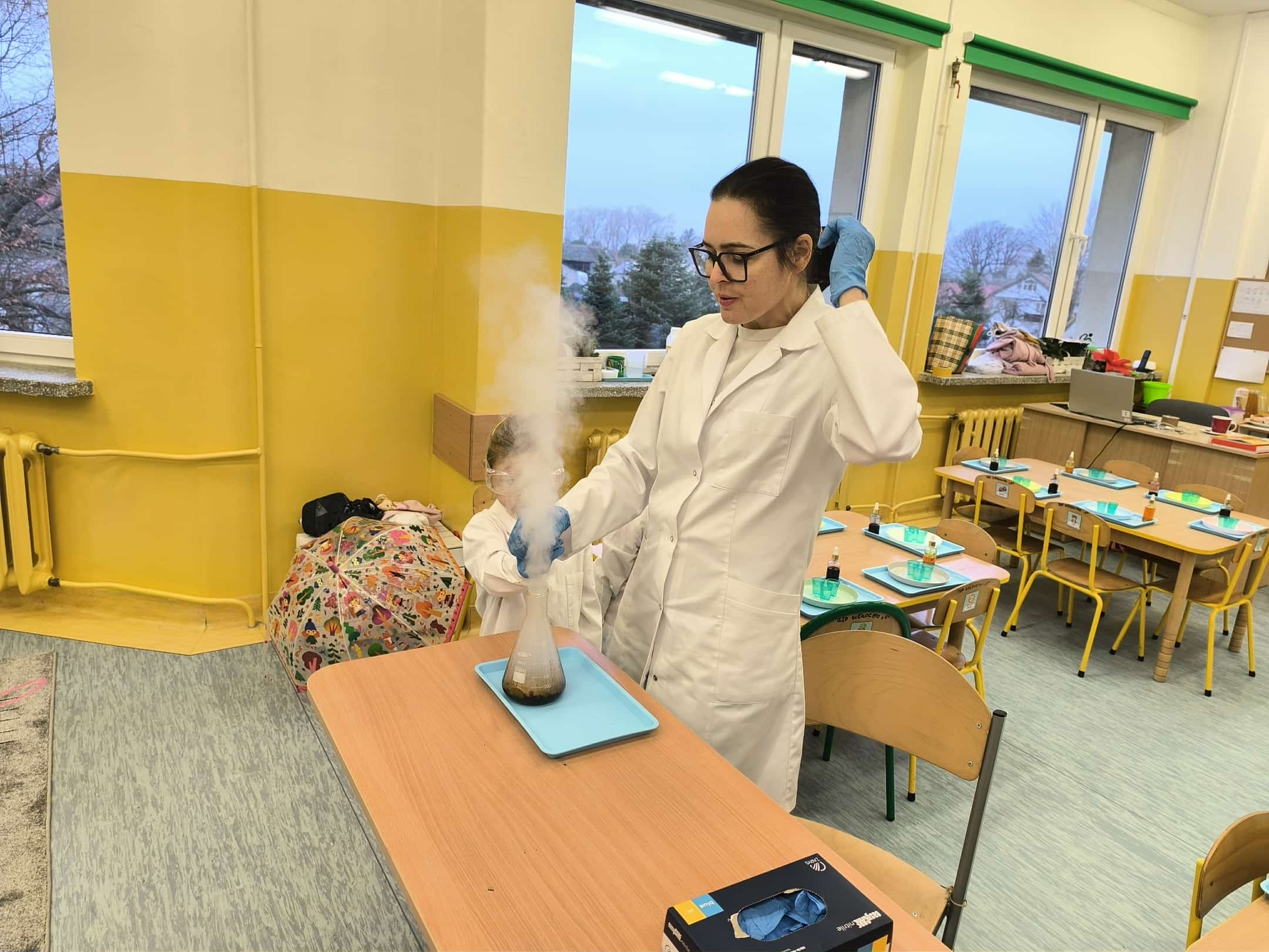 W środę, 20 listopada, w naszym przedszkolu oraz w klasach 0–3 odbyły się wyjątkowe warsztaty edukacyjne „Laboratorium Małego Chemika”, prowadzone przez firmę Logosfera. Spotkanie pełne barwnych doświadczeń i fascynujących eksperymentów przeniosło dzieci w świat nauki, pobudziło ich ciekawość oraz pokazało, że chemia może być niezwykle interesująca – i całkowicie bezpieczna.