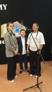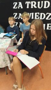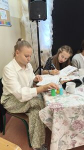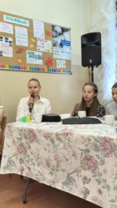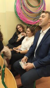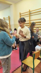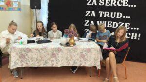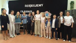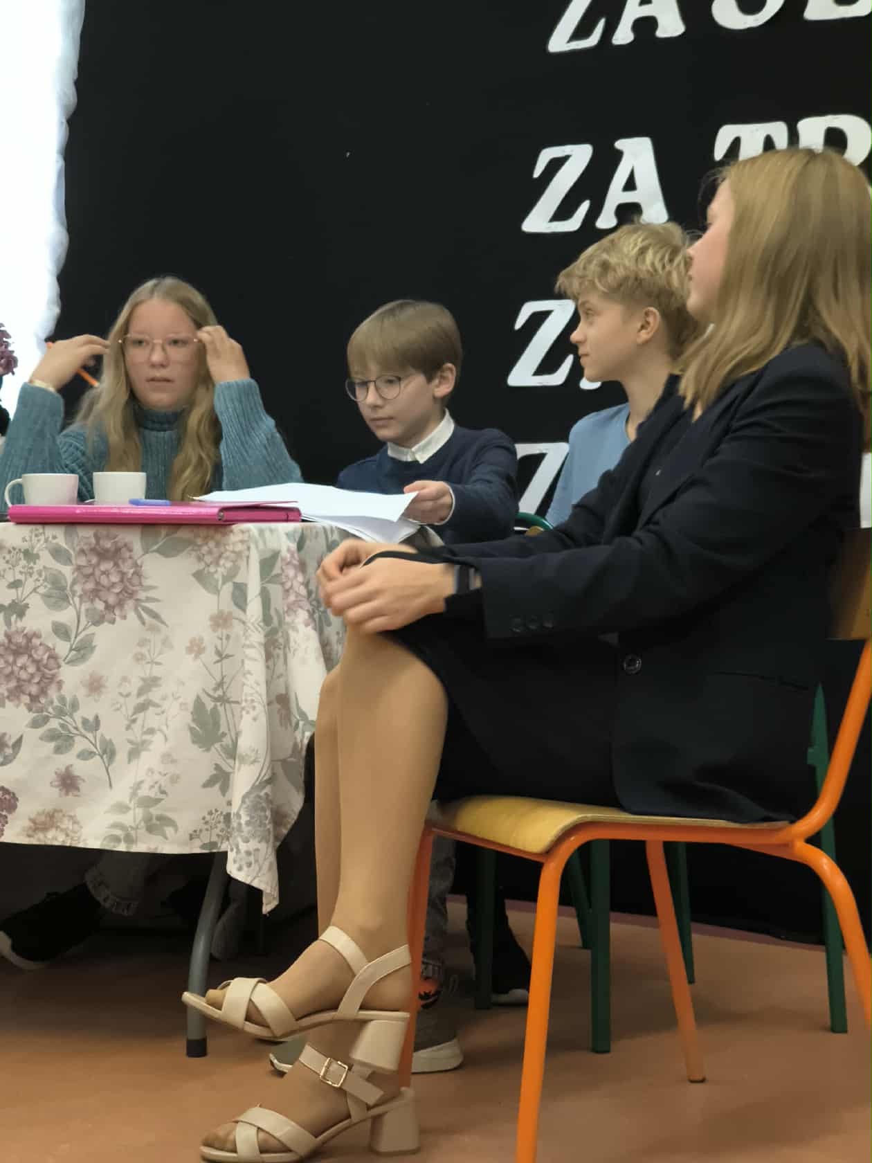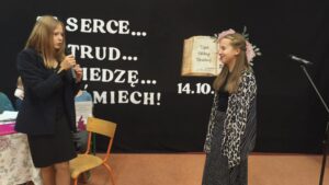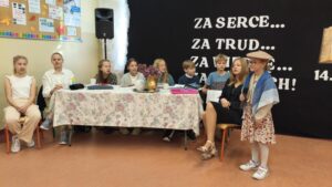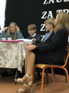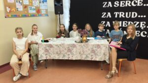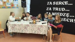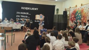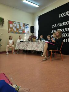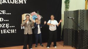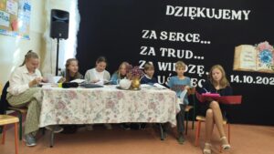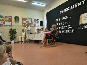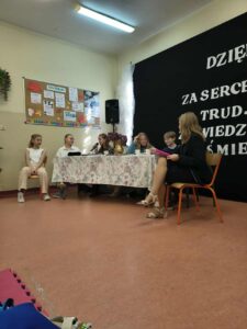 Nie zabrakło również części artystycznej. Uczniowie należący do koła teatralnego, które działa dzięki realizacji projektu Choczewo. Gmina Napędzana Wiatrem w ramach projektu „W młodzieży siła” przygotowali humorystyczne przedstawienie pt. „Rozmowy podczas przerwy w pokoju nauczycielskim”, które wywołało wiele uśmiechów i wprowadziło radosny nastrój wśród zgromadzonych.