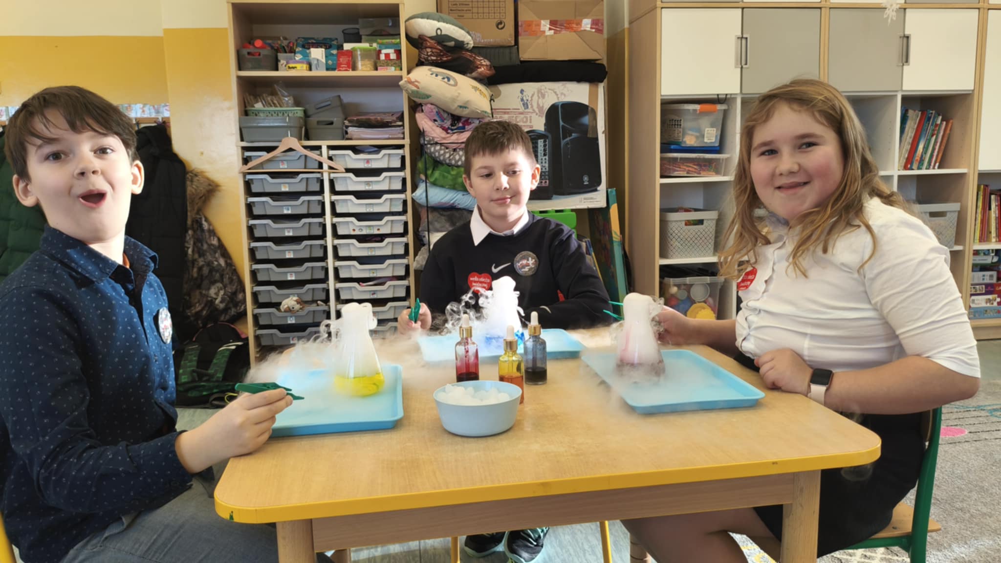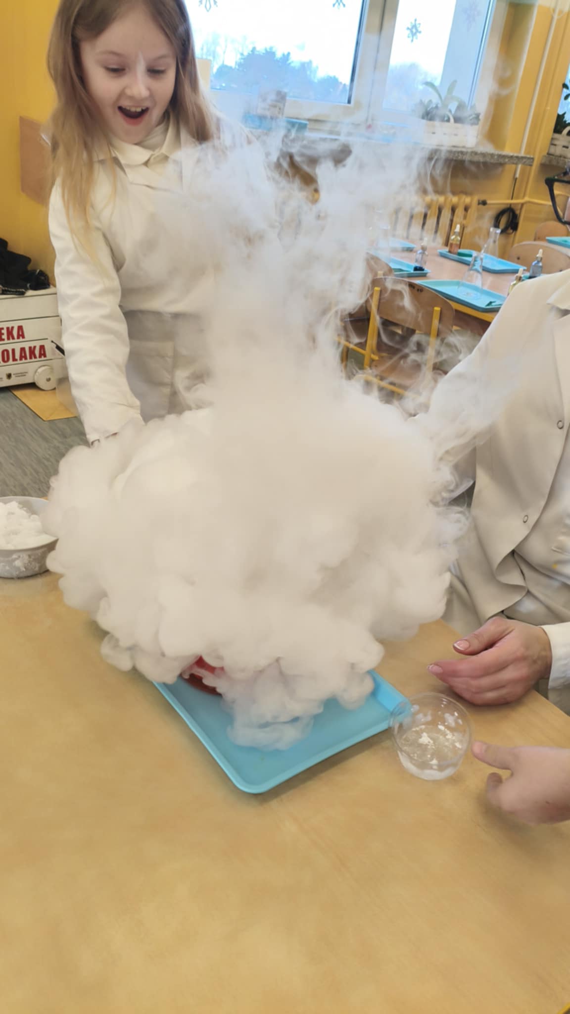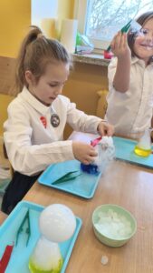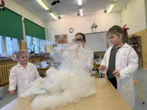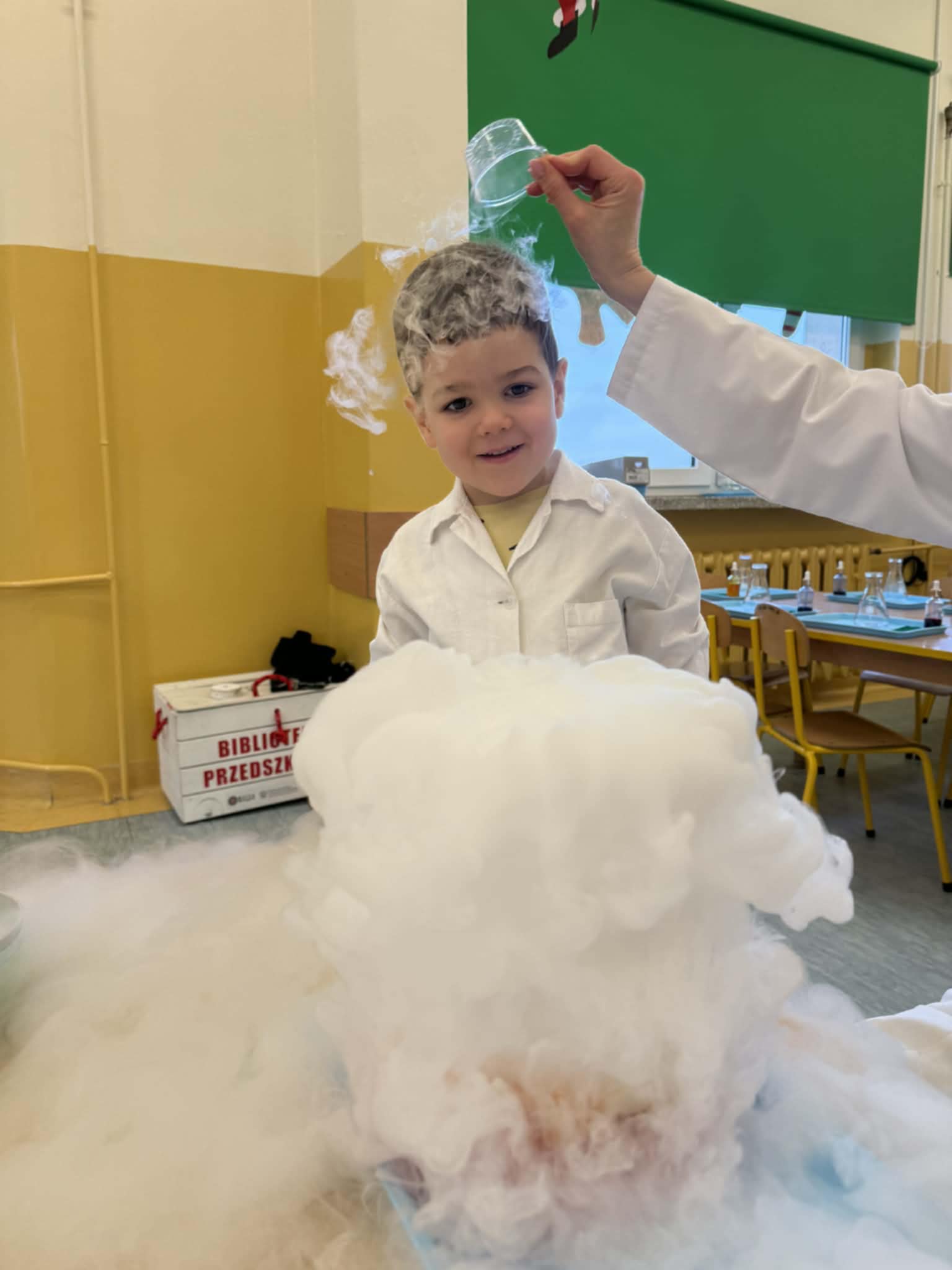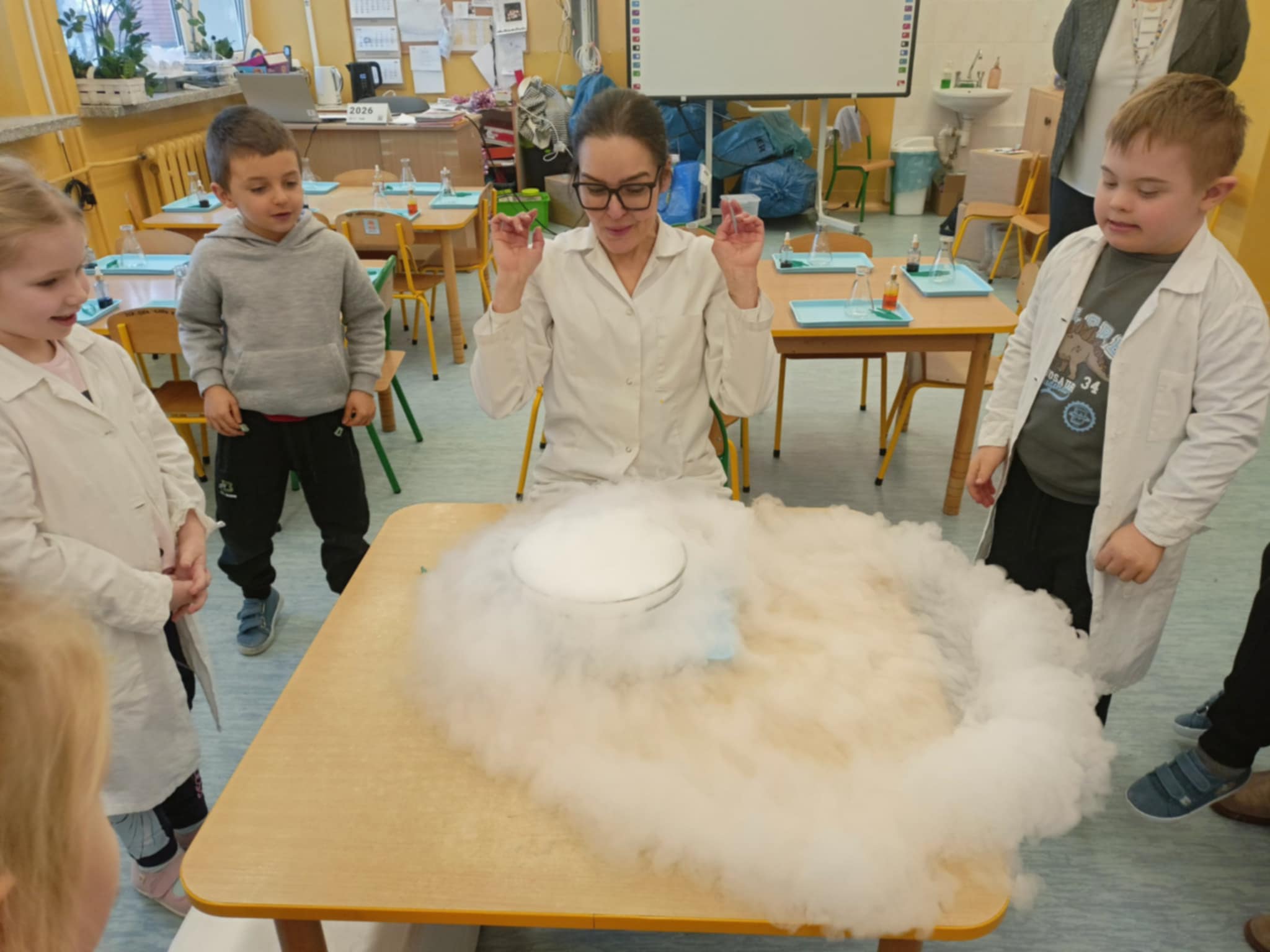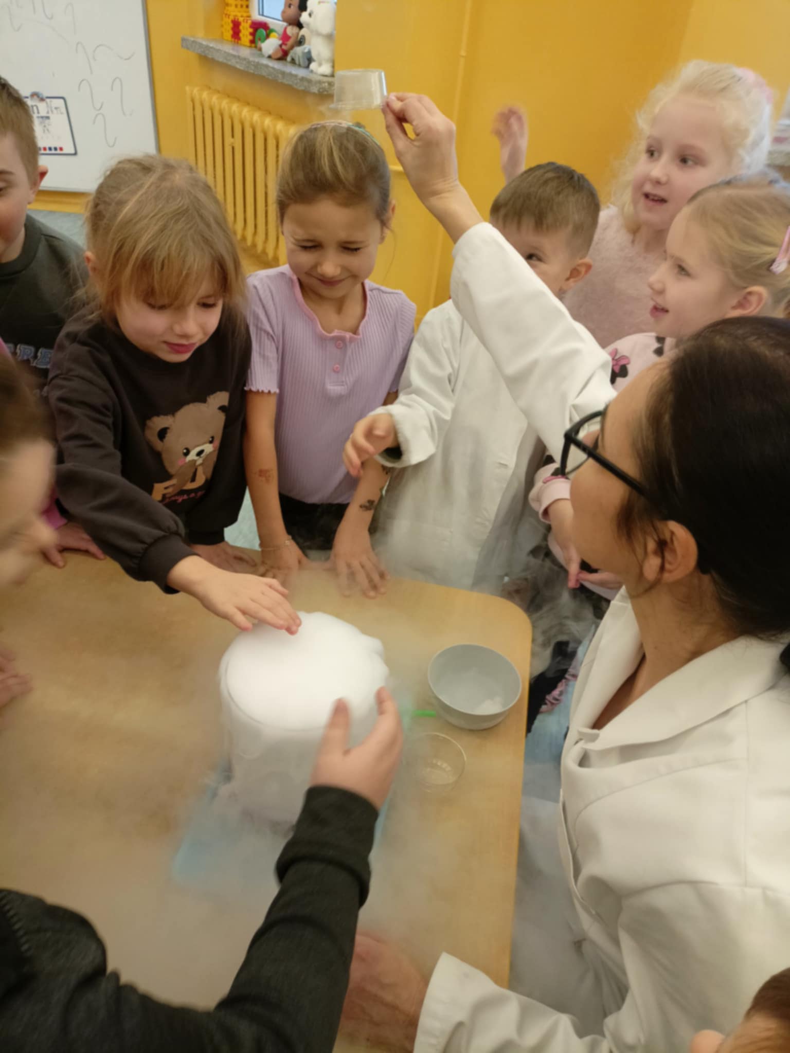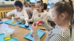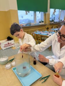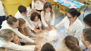 Dzisiaj w naszej szkole odbyły się niezwykle ciekawe pokazy i eksperymenty naukowe skierowane do grup przedszkolnych oraz uczniów klas I–III. Głównym bohaterem spotkania był suchy lód, który w widowiskowy sposób wprowadził dzieci w świat nauki i fascynujących zjawisk fizycznych. Uczniowie mieli okazję odkryć tajemnice ekstremalnie niskich temperatur, obserwować „dymiące” reakcje, zjawisko znikającej materii oraz inne efektowne doświadczenia, które wzbudziły ogromne zainteresowanie i zachwyt. Pokazy były nie tylko atrakcyjne wizualnie, ale przede wszystkim miały charakter edukacyjny – dzieci aktywnie uczestniczyły w eksperymentach, zadawały pytania i z ciekawością poznawały naukowe wyjaśnienia obserwowanych zjawisk.