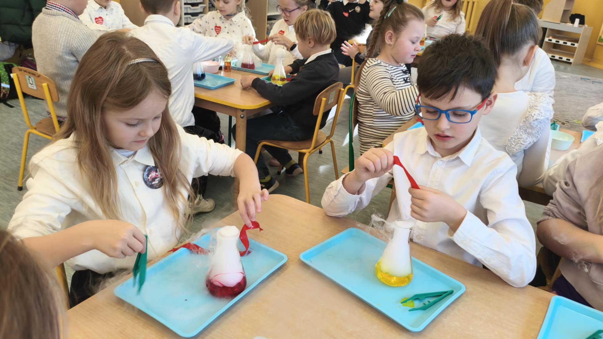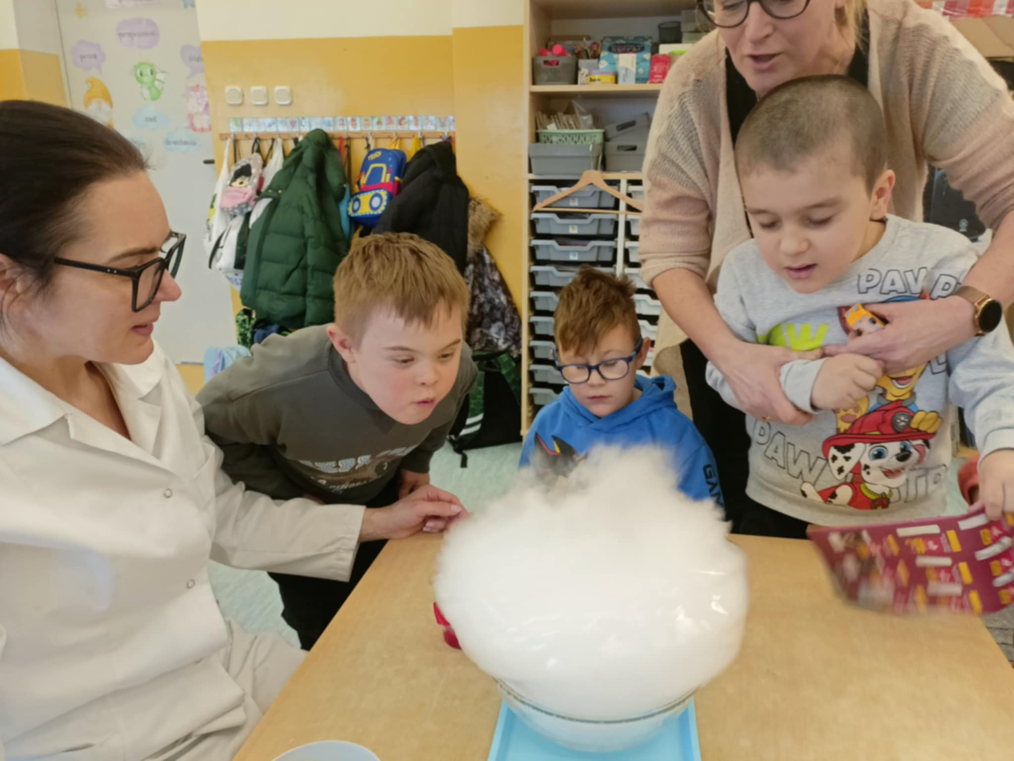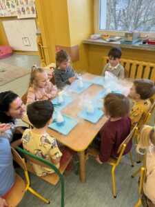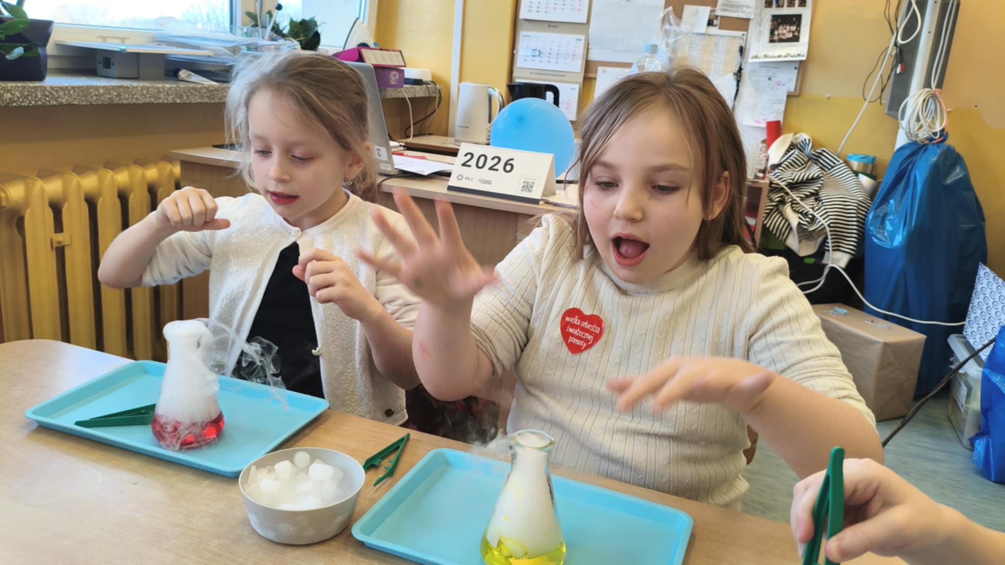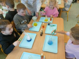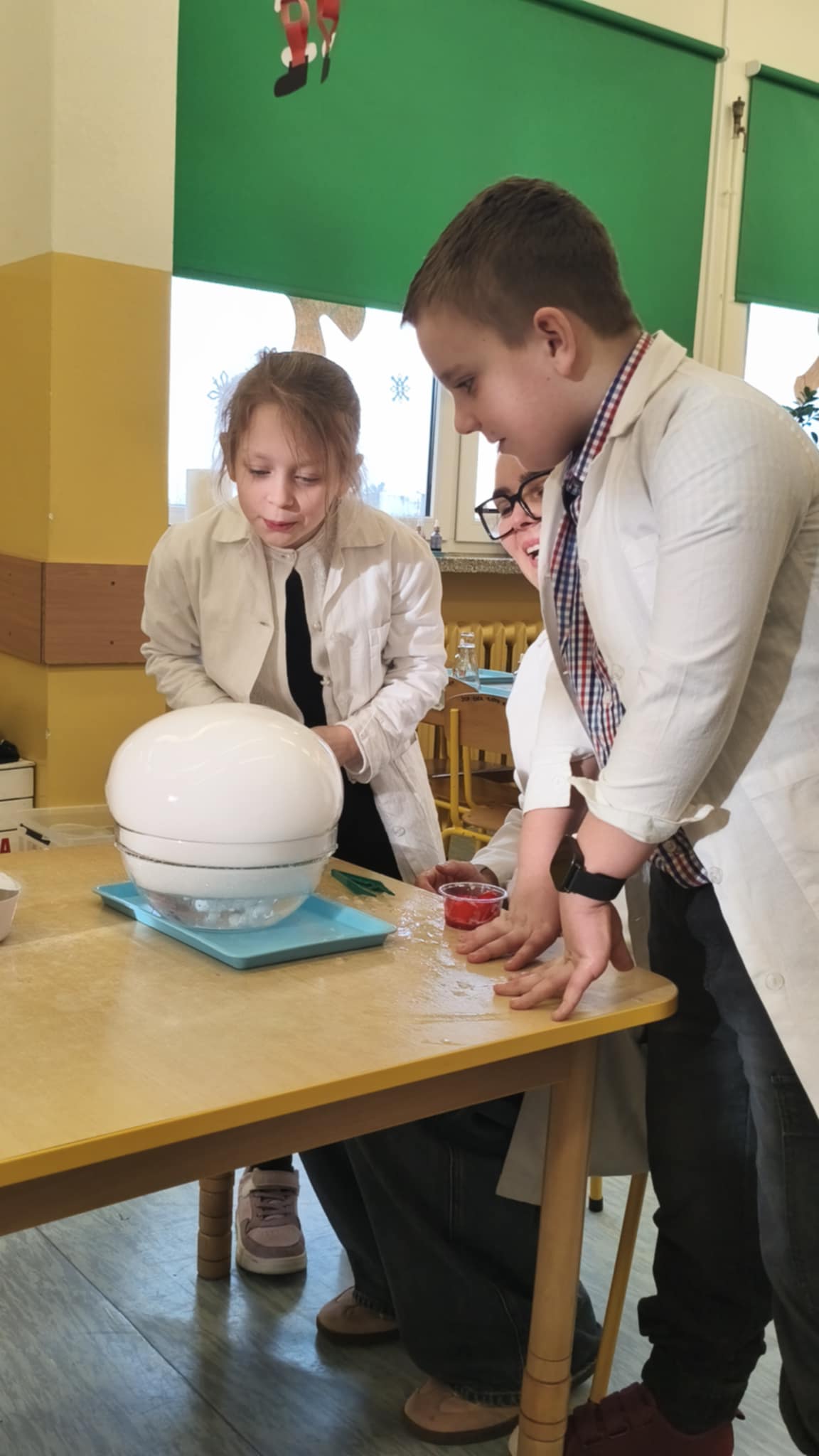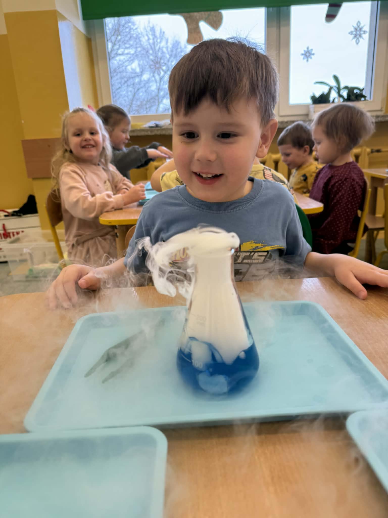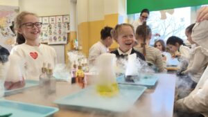 Dzisiaj w naszej szkole odbyły się niezwykle ciekawe pokazy i eksperymenty naukowe skierowane do grup przedszkolnych oraz uczniów klas I–III. Głównym bohaterem spotkania był suchy lód, który w widowiskowy sposób wprowadził dzieci w świat nauki i fascynujących zjawisk fizycznych. Uczniowie mieli okazję odkryć tajemnice ekstremalnie niskich temperatur, obserwować „dymiące” reakcje, zjawisko znikającej materii oraz inne efektowne doświadczenia, które wzbudziły ogromne zainteresowanie i zachwyt. Pokazy były nie tylko atrakcyjne wizualnie, ale przede wszystkim miały charakter edukacyjny – dzieci aktywnie uczestniczyły w eksperymentach, zadawały pytania i z ciekawością poznawały naukowe wyjaśnienia obserwowanych zjawisk.