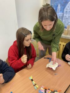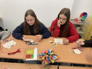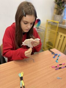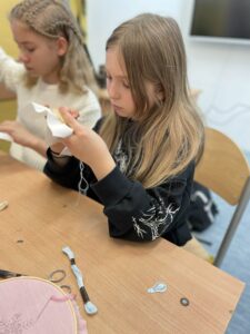 Piątoklasiści już wcześniej poznali szkoły haftu kaszubskiego, a podczas warsztatów mogli spróbować własnych sił w wyszywaniu tradycyjnych wzorów. Dzięki wskazówkom i cierpliwości prowadzącej, uczniowie wykonali swoje pierwsze prace, przekonując się, że to nie tylko piękna, ale i wymagająca sztuka.
