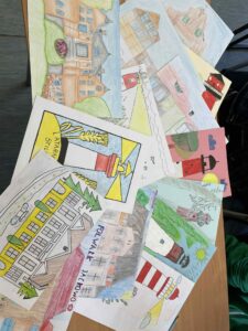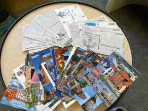 Nasi uczniowie samodzielnie przygotowali pocztówki, na których znalazły się charakterystyczne miejsca naszej gminy. Każda kartka została wzbogacona o pozdrowienia zapisane w języku kaszubskim, a następnie wysłana do uczniów w Słupsku. W zamian otrzymaliśmy piękne pocztówki przedstawiające miasto naszych partnerów oraz własnoręcznie napisane przez nich życzenia.